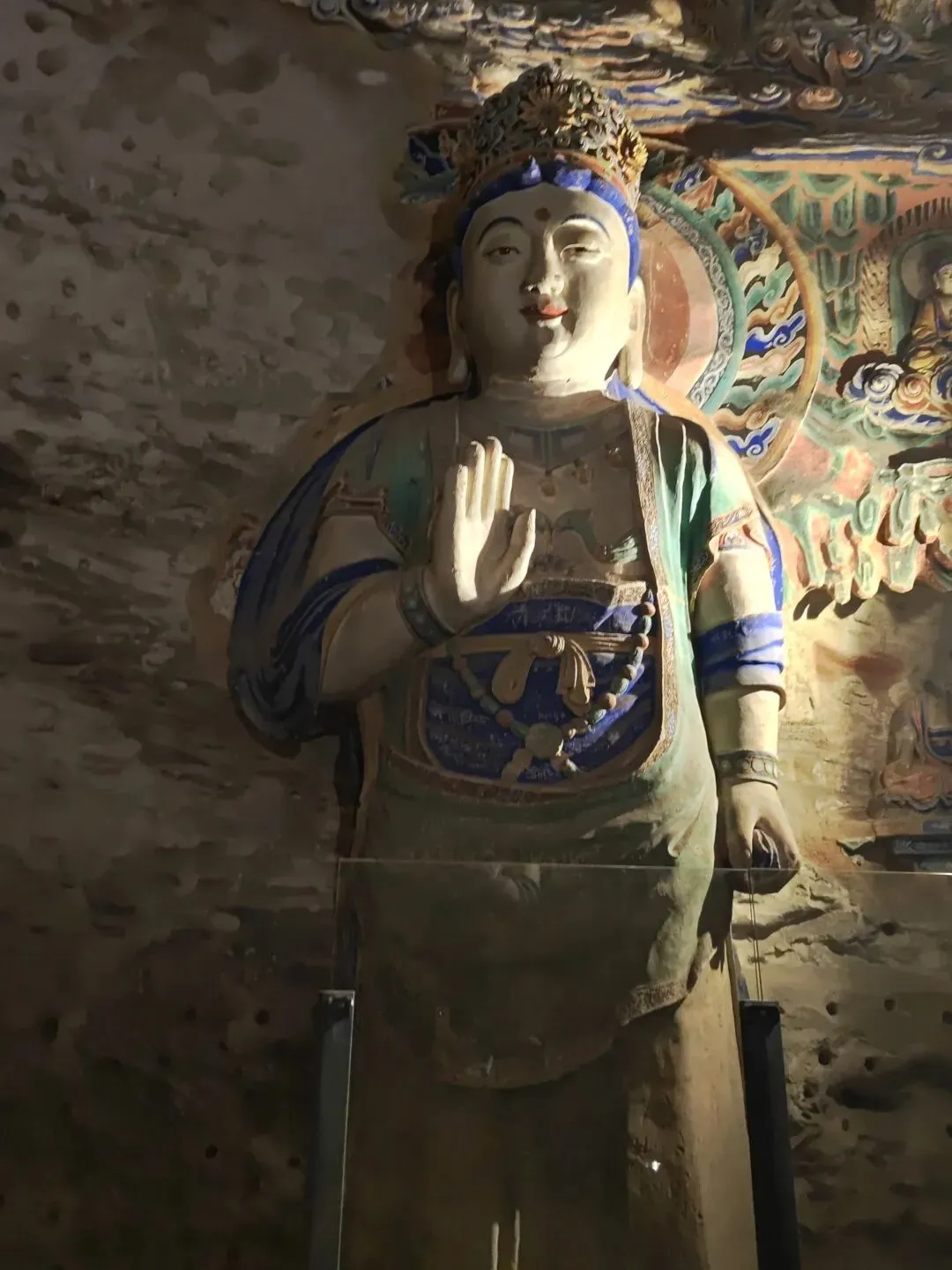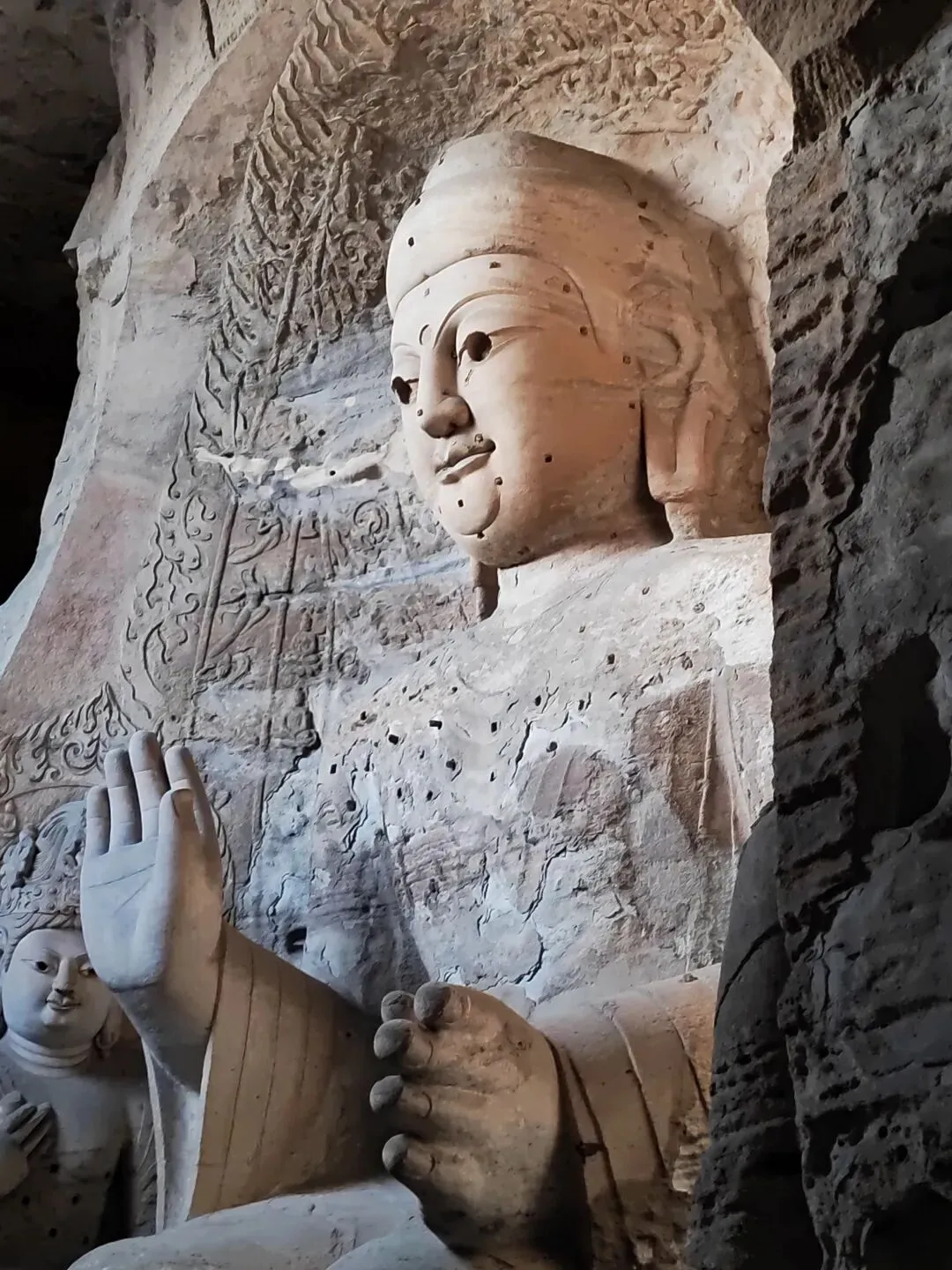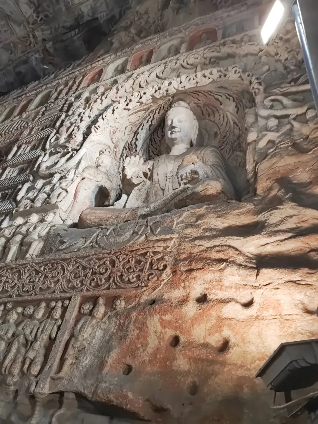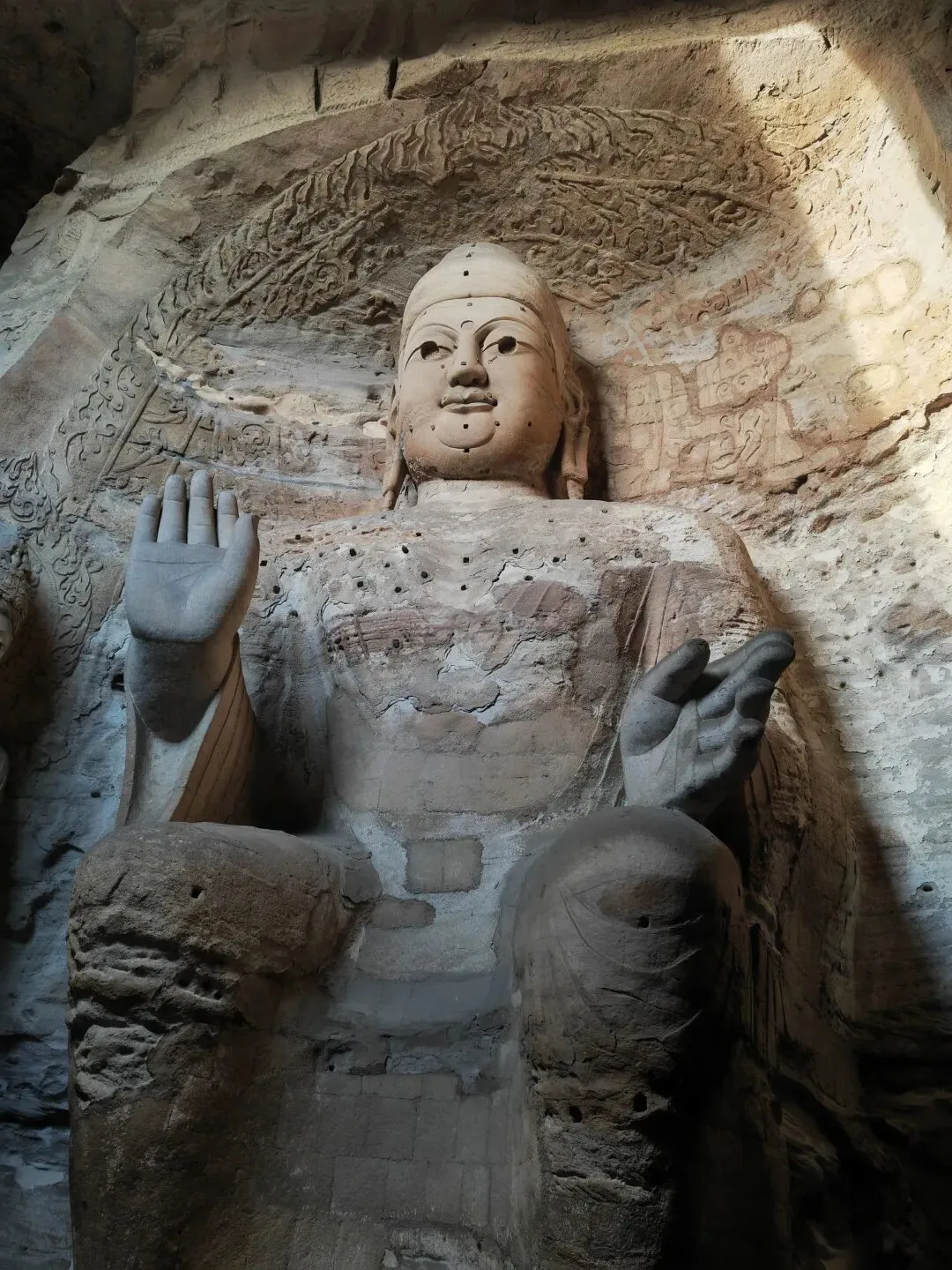 去年岁末严寒,和女儿一起大漠放逐、敦煌吹风,饱览了莫高窟的千年艺术精华。今年10月又顺路去了趟太原,参观了太原博物馆和晋祠,女儿还送了本《山西国宝》,这下被山西国宝深深迷住了,在这个岁末将至,周末抽空专门去趟塞北,去佛都大同。其实大同回来已有一段时间了,但大同带给我的震撼更强烈,以至于迟迟不敢轻易动笔。 西安到大同的动车下午一点多到大同南站,直接换乘景区直通车去云冈石窟。路过看到大同古城墙,冬日暖阳下的古城宁静而庄严,这座横亘北纬40°的古城,将三千年岁月沉淀为可触摸的温度,把塞北风情与文明底蕴揉成了浸润心灵的美,一走进就喜欢上这座城。 来到云冈景区入口,进去先是礼佛大道,是景区入口与石窟群的连接通道。两行石雕柱子位于礼佛大道两侧,对称排列着13对(共26根)骑象四棱柱。 神柱高8.73米,由黄沙岩雕刻而成。聚讲解这些石雕柱子是参照云冈石窟中第九窟和第十窟里的柱子复制的。柱体为八棱多立克柱式,柱身浮雕佛像及缠枝忍冬纹,寓意永生。 柱体上雕刻有多层小佛像,体现了“十方十世皆佛”的大乘佛教思想。塔柱上层四面雕有“四方佛”,四角由大象承托九级楼阁式方塔。每根神柱下方还雕刻着供养人,衣着服饰具有鲜明的北魏特色。底座为汉代博山炉造型,象征佛教供养法器。六牙白象驮塔,象征普贤菩萨,青毛狮子是文殊菩萨坐骑,体现了佛教护法精神。 我的拎包队友,刚到云冈景区灵岩寺就被佛光照见,幸哉! 灵岩寺里的香樟木雕佛像。历史上的灵岩寺是北魏文成帝时期(453年)高僧昙曜主持开凿“昙曜五窟”时所建的皇家寺院,是当时云冈石窟“十寺”(通乐、灵岩、鲸崇、镇国、护国等)之一,为皇家礼佛的 核心场所 。而现在的灵岩寺为2009年重建,进入云冈景区东侧就是灵岩寺,典型的北魏“一斗三升人字拱”风格,再现“皇家古院,山堂水殿”的历史风貌。 云冈石窟的开凿契机是公元398年,拓跋珪将都城从盛乐迁至平城,按照汉文化传统大规模营建,修建宫室、宗庙、社稷,设置司州,平城成为北方政治、经济、文化中心,汇聚中亚商人,器物与文化交融,为云冈石窟开凿奠定了基础。 道武帝拓跋珪信佛,迁都后就开始建佛寺。到了文成帝时,高僧昙曜主持开凿昙曜五窟(16-20窟),云冈石窟成为佛教艺术中国化的开端。 我们租了景区讲解器,刚走进石窟群看到的这个小型窟龛已经风化严重,聚讲解:云冈石窟的砂岩岩体易吸水且酥松,山体内部的水汽渗透加上外部的风吹日晒,使得这类外露的小型造像成为风化最严重的部分之一,也直观展现了千年石窟在自然侵蚀下的岁月痕迹。 这尊应该是北魏晚期的民间石窟,规模小,佛像清瘦小。今天的云冈石窟天气特别好,湛蓝的天空让人对大同从煤城污染严重到现在综合治理后的环境有了新的印象。先讲解第1、2窟(双窟),这是云冈最早开凿的一组双窟,第1窟中心为仿汉式楼阁塔柱,第2窟中心为方塔,体现了北魏时期佛教与汉地建筑的融合。由于碰上施工暂不开放。所以往前走到第3窟,这是云冈体量最大的石窟:高约45米,开窟面阔达50米,前面的断崖高25米,是云冈所有洞窟里最宏伟的一座。 分为前后室,前室立壁分上下两层,上层有12个方形梁孔,推测当年窟前曾建有面阔十一间的木构寺庙,这也是它“灵岩寺洞”名称的由来。始凿于北魏时期,但因历史变故并未完工,现存的一佛二菩萨造像(西方三圣)是隋唐时期续刻的,风格与北魏造像有明显不同。这也是未完成的遗憾。 今天天气好,蓝天衬托下更显得宏伟沧桑。刚好也是未开放,未能入内。云冈石窟第5、6窟是一组双窟,是云冈石窟中保存最完整、内容最丰富、雕刻最精美的洞窟之一 。 第5窟后室北壁主像为三世佛,中央坐像高17米,是云冈石窟最大的佛像。 第6窟:窟平面近方形,中央是一个连接窟顶的两层方形塔柱,高约15米。塔柱四面大龛两侧和窟东、南、西三壁以及明窗两侧,雕出33幅描写释迦牟尼从诞生到成道的佛传故事浮雕,此窟规模宏伟,雕饰富丽,技法精炼,是云冈石窟中最有代表性的一个。今天这两个窟正常对外开放,人也少,可以进去一饱眼福。尤其6窟真的是一座有历史厚重感的雕刻博物馆。第七窟南壁上的六女神,梁思成林徽因夫妇认可的北魏女神。多美的笑,让人一下忘掉所有烦恼。菩萨的笑是那么传神,穿透千年时光依然能感染我们。 这尊交脚而坐的造像为弥勒菩萨,是未来佛的象征,其头戴宝冠、身佩璎珞的装饰风格,体现了北魏时期皇家造像的华丽特征。也是第六窟精美的石刻艺术典范。随手拍一张都是登峰造极的艺术精品。 午后阳光洒在石窟入口,给石窟披上了彩色的外衣。这里就是七、八窟。洞窟外的木构楼阁是后世为保护石窟而建的。 今天第7、8两窟正常对外开放。这以华丽的“五华洞”风格著称,外壁布满菩萨、力士和飞天浮雕,装饰极为精美- 双窟政治寓意:第7、8窟的双窟设计,对应北魏中期“二圣并尊”(冯太后与孝文帝)的政治格局,体现了佛教艺术与皇权的紧密结合。 既保留了早期犍陀罗艺术的粗犷厚重,又展现了中期汉化风格的细腻飘逸,是云冈石窟从“胡风”向“汉韵”转变的关键节点。 从护法神的印度教元素到飞天的中原审美,反映了北魏时期丝绸之路的文化交流与包容。 这尊菩萨像也是云冈里唯一的露齿微笑菩萨。第九窟入口最显著的特征是仿希腊神庙式的