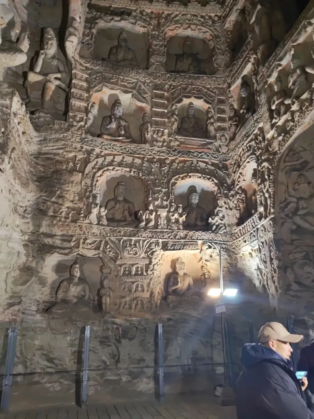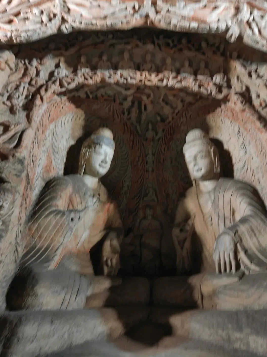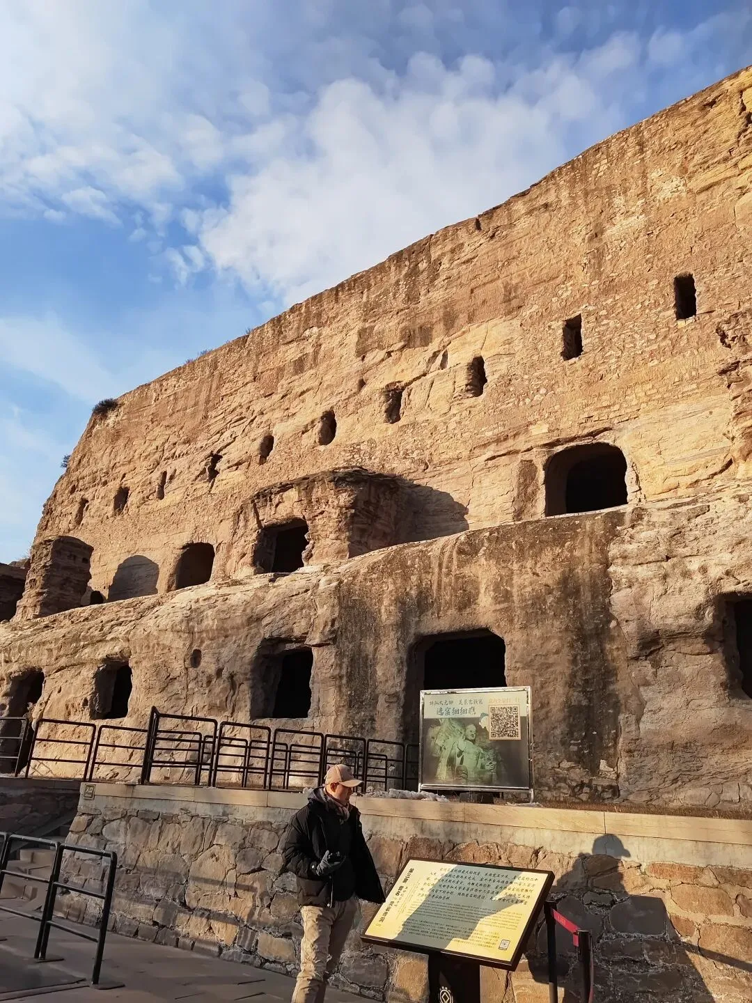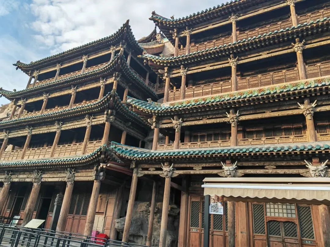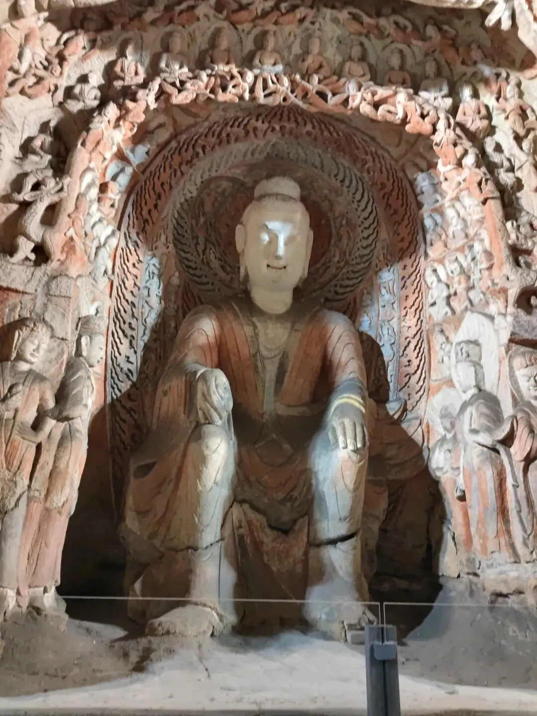 去年岁末严寒,和女儿一起大漠放逐、敦煌吹风,饱览了莫高窟的千年艺术精华。今年10月又顺路去了趟太原,参观了太原博物馆和晋祠,女儿还送了本《山西国宝》,这下被山西国宝深深迷住了,在这个岁末将至,周末抽空专门去趟塞北,去佛都大同。其实大同回来已有一段时间了,但大同带给我的震撼更强烈,以至于迟迟不敢轻易动笔。 西安到大同的动车下午一点多到大同南站,直接换乘景区直通车去云冈石窟。路过看到大同古城墙,冬日暖阳下的古城宁静而庄严,这座横亘北纬40°的古城,将三千年岁月沉淀为可触摸的温度,把塞北风情与文明底蕴揉成了浸润心灵的美,一走进就喜欢上这座城。 来到云冈景区入口,进去先是礼佛大道,是景区入口与石窟群的连接通道。两行石雕柱子位于礼佛大道两侧,对称排列着13对(共26根)骑象四棱柱。 神柱高8.73米,由黄沙岩雕刻而成。聚讲解这些石雕柱子是参照云冈石窟中第九窟和第十窟里的柱子复制的。柱体为八棱多立克柱式,柱身浮雕佛像及缠枝忍冬纹,寓意永生。 柱体上雕刻有多层小佛像,体现了“十方十世皆佛”的大乘佛教思想。塔柱上层四面雕有“四方佛”,四角由大象承托九级楼阁式方塔。每根神柱下方还雕刻着供养人,衣着服饰具有鲜明的北魏特色。底座为汉代博山炉造型,象征佛教供养法器。六牙白象驮塔,象征普贤菩萨,青毛狮子是文殊菩萨坐骑,体现了佛教护法精神。 我的拎包队友,刚到云冈景区灵岩寺就被佛光照见,幸哉! 灵岩寺里的香樟木雕佛像。历史上的灵岩寺是北魏文成帝时期(453年)高僧昙曜主持开凿“昙曜五窟”时所建的皇家寺院,是当时云冈石窟“十寺”(通乐、灵岩、鲸崇、镇国、护国等)之一,为皇家礼佛的 核心场所 。而现在的灵岩寺为2009年重建,进入云冈景区东侧就是灵岩寺,典型的北魏“一斗三升人字拱”风格,再现“皇家古院,山堂水殿”的历史风貌。 云冈石窟的开凿契机是公元398年,拓跋珪将都城从盛乐迁至平城,按照汉文化传统大规模营建,修建宫室、宗庙、社稷,设置司州,平城成为北方政治、经济、文化中心,汇聚中亚商人,器物与文化交融,为云冈石窟开凿奠定了基础。 道武帝拓跋珪信佛,迁都后就开始建佛寺。到了文成帝时,高僧昙曜主持开凿昙曜五窟(16-20窟),云冈石窟成为佛教艺术中国化的开端。 我们租了景区讲解器,刚走进石窟群看到的这个小型窟龛已经风化严重,聚讲解:云冈石窟的砂岩岩体易吸水且酥松,山体内部的水汽渗透加上外部的风吹日晒,使得这类外露的小型造像成为风化最严重的部分之一,也直观展现了千年石窟在自然侵蚀下的岁月痕迹。 这尊应该是北魏晚期的民间石窟,规模小,佛像清瘦小。今天的云冈石窟天气特别好,湛蓝的天空让人对大同从煤城污染严重到现在综合治理后的环境有了新的印象。先讲解第1、2窟(双窟),这是云冈最早开凿的一组双窟,第1窟中心为仿汉式楼阁塔柱,第2窟中心为方塔,体现了北魏时期佛教与汉地建筑的融合。由于碰上施工暂不开放。所以往前走到第3窟,这是云冈体量最大的石窟:高约45米,开窟面阔达50米,前面的断崖高25米,是云冈所有洞窟里最宏伟的一座。 分为前后室,前室立壁分上下两层,上层有12个方形梁孔,推测当年窟前曾建有面阔十一间的木构寺庙,这也是它“灵岩寺洞”名称的由来。始凿于北魏时期,但因历史变故并未完工,现存的一佛二菩萨造像(西方三圣)是隋唐时期续刻的,风格与北魏造像有明显不同。这也是未完成的遗憾。 今天天气好,蓝天衬托下更显得宏伟沧桑。刚好也是未开放,未能入内。云冈石窟第5、6窟是一组双窟,是云冈石窟中保存最完整、内容最丰富、雕刻最精美的洞窟之一 。 第5窟后室北壁主像为三世佛,中央坐像高17米,是云冈石窟最大的佛像。 第6窟:窟平面近方形,中央是一个连接窟顶的两层方形塔柱,高约15米。塔柱四面大龛两侧和窟东、南、西三壁以及明窗两侧,雕出33幅描写释迦牟尼从诞生到成道的佛传故事浮雕,此窟规模宏伟,雕饰富丽,技法精炼,是云冈石窟中最有代表性的一个。今天这两个窟正常对外开放,人也少,可以进去一饱眼福。尤其6窟真的是一座有历史厚重感的雕刻博物馆。第七窟南壁上的六女神,梁思成林徽因夫妇认可的北魏女神。多美的笑,让人一下忘掉所有烦恼。菩萨的笑是那么传神,穿透千年时光依然能感染我们。 这尊交脚而坐的造像为弥勒菩萨,是未来佛的象征,其头戴宝冠、身佩璎珞的装饰风格,体现了北魏时期皇家造像的华丽特征。也是第六窟精美的石刻艺术典范。随手拍一张都是登峰造极的艺术精品。 午后阳光洒在石窟入口,给石窟披上了彩色的外衣。这里就是七、八窟。洞窟外的木构楼阁是后世为保护石窟而建的。 今天第7、8两窟正常对外开放。这以华丽的“五华洞”风格著称,外壁布满菩萨、力士和飞天浮雕,装饰极为精美- 双窟政治寓意:第7、8窟的双窟设计,对应北魏中期“二圣并尊”(冯太后与孝文帝)的政治格局,体现了佛教艺术与皇权的紧密结合。 既保留了早期犍陀罗艺术的粗犷厚重,又展现了中期汉化风格的细腻飘逸,是云冈石窟从“胡风”向“汉韵”转变的关键节点。 从护法神的印度教元素到飞天的中原审美,反映了北魏时期丝绸之路的文化交流与包容。 这尊菩萨像也是云冈里唯一的露齿微笑菩萨。第九窟入口最显著的特征是仿希腊神庙式的