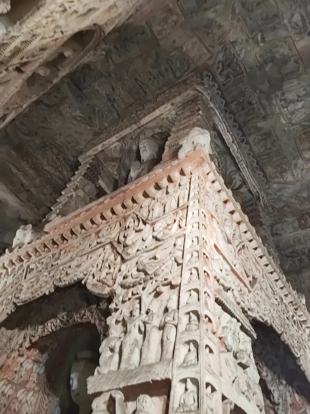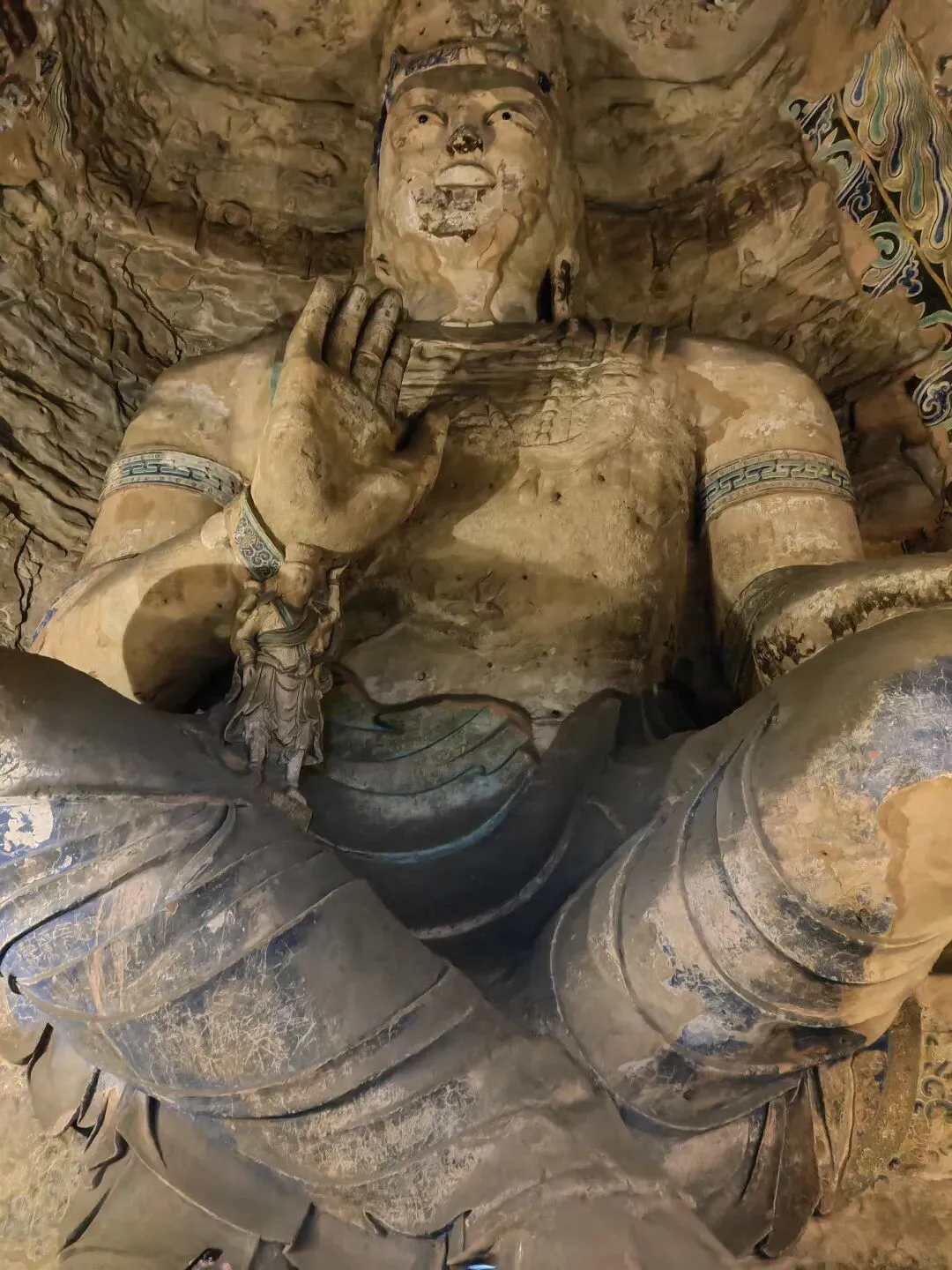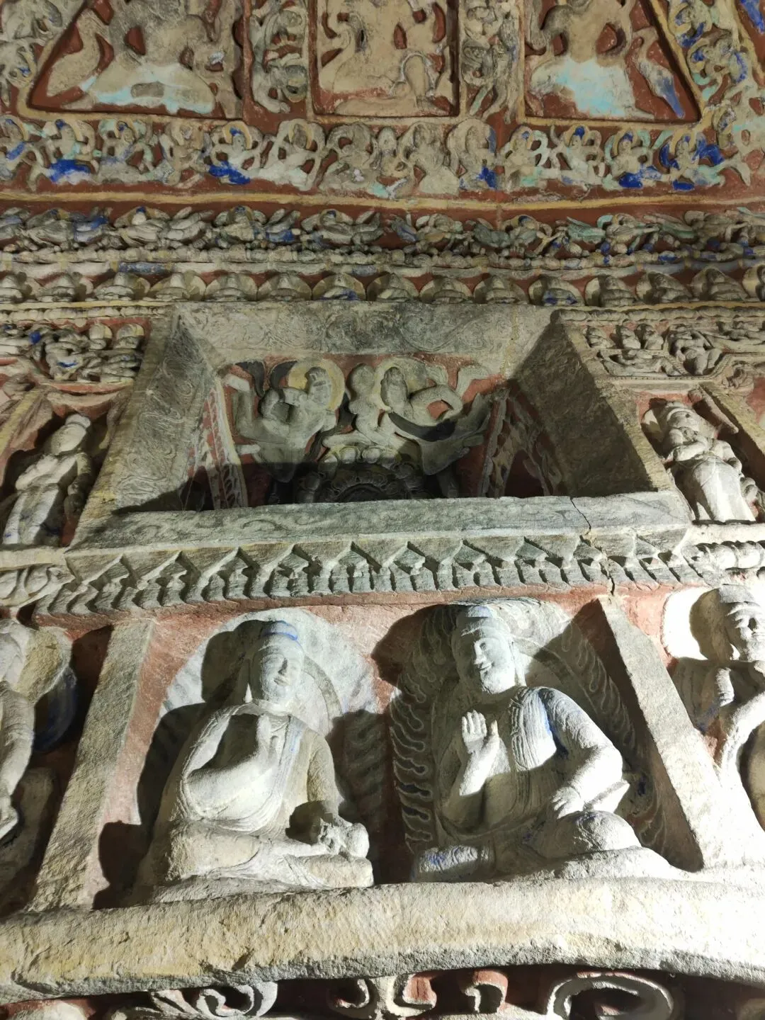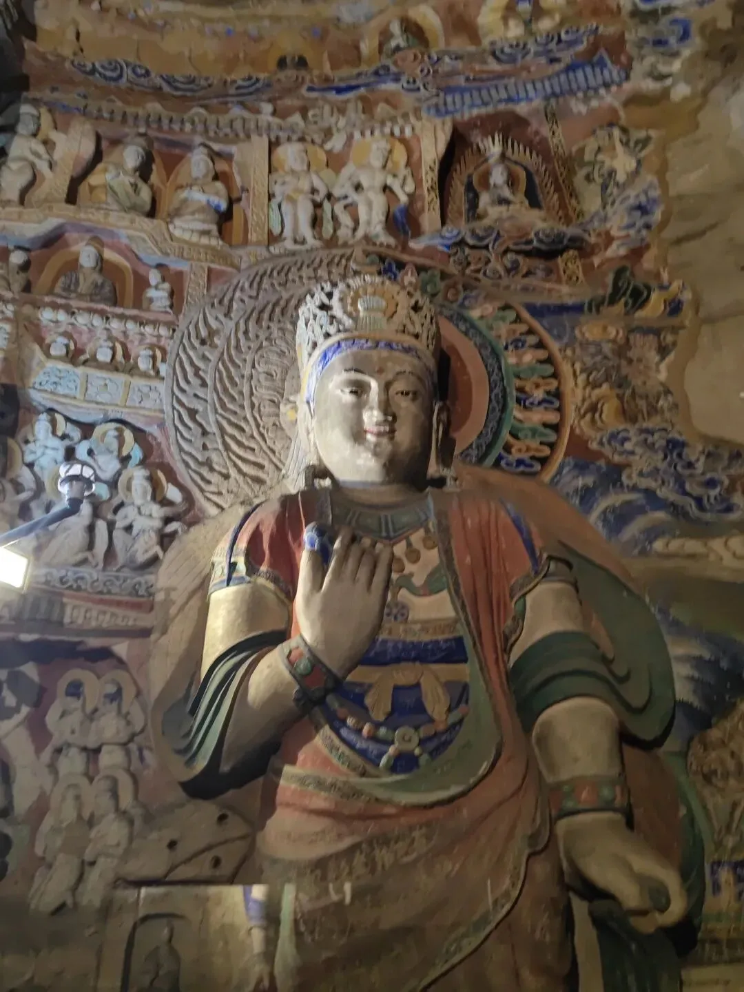 去年岁末严寒,和女儿一起大漠放逐、敦煌吹风,饱览了莫高窟的千年艺术精华。今年10月又顺路去了趟太原,参观了太原博物馆和晋祠,女儿还送了本《山西国宝》,这下被山西国宝深深迷住了,在这个岁末将至,周末抽空专门去趟塞北,去佛都大同。其实大同回来已有一段时间了,但大同带给我的震撼更强烈,以至于迟迟不敢轻易动笔。 西安到大同的动车下午一点多到大同南站,直接换乘景区直通车去云冈石窟。路过看到大同古城墙,冬日暖阳下的古城宁静而庄严,这座横亘北纬40°的古城,将三千年岁月沉淀为可触摸的温度,把塞北风情与文明底蕴揉成了浸润心灵的美,一走进就喜欢上这座城。 来到云冈景区入口,进去先是礼佛大道,是景区入口与石窟群的连接通道。两行石雕柱子位于礼佛大道两侧,对称排列着13对(共26根)骑象四棱柱。 神柱高8.73米,由黄沙岩雕刻而成。聚讲解这些石雕柱子是参照云冈石窟中第九窟和第十窟里的柱子复制的。柱体为八棱多立克柱式,柱身浮雕佛像及缠枝忍冬纹,寓意永生。 柱体上雕刻有多层小佛像,体现了“十方十世皆佛”的大乘佛教思想。塔柱上层四面雕有“四方佛”,四角由大象承托九级楼阁式方塔。每根神柱下方还雕刻着供养人,衣着服饰具有鲜明的北魏特色。底座为汉代博山炉造型,象征佛教供养法器。六牙白象驮塔,象征普贤菩萨,青毛狮子是文殊菩萨坐骑,体现了佛教护法精神。 我的拎包队友,刚到云冈景区灵岩寺就被佛光照见,幸哉! 灵岩寺里的香樟木雕佛像。历史上的灵岩寺是北魏文成帝时期(453年)高僧昙曜主持开凿“昙曜五窟”时所建的皇家寺院,是当时云冈石窟“十寺”(通乐、灵岩、鲸崇、镇国、护国等)之一,为皇家礼佛的 核心场所 。而现在的灵岩寺为2009年重建,进入云冈景区东侧就是灵岩寺,典型的北魏“一斗三升人字拱”风格,再现“皇家古院,山堂水殿”的历史风貌。 云冈石窟的开凿契机是公元398年,拓跋珪将都城从盛乐迁至平城,按照汉文化传统大规模营建,修建宫室、宗庙、社稷,设置司州,平城成为北方政治、经济、文化中心,汇聚中亚商人,器物与文化交融,为云冈石窟开凿奠定了基础。 道武帝拓跋珪信佛,迁都后就开始建佛寺。到了文成帝时,高僧昙曜主持开凿昙曜五窟(16-20窟),云冈石窟成为佛教艺术中国化的开端。 我们租了景区讲解器,刚走进石窟群看到的这个小型窟龛已经风化严重,聚讲解:云冈石窟的砂岩岩体易吸水且酥松,山体内部的水汽渗透加上外部的风吹日晒,使得这类外露的小型造像成为风化最严重的部分之一,也直观展现了千年石窟在自然侵蚀下的岁月痕迹。 这尊应该是北魏晚期的民间石窟,规模小,佛像清瘦小。今天的云冈石窟天气特别好,湛蓝的天空让人对大同从煤城污染严重到现在综合治理后的环境有了新的印象。先讲解第1、2窟(双窟),这是云冈最早开凿的一组双窟,第1窟中心为仿汉式楼阁塔柱,第2窟中心为方塔,体现了北魏时期佛教与汉地建筑的融合。由于碰上施工暂不开放。所以往前走到第3窟,这是云冈体量最大的石窟:高约45米,开窟面阔达50米,前面的断崖高25米,是云冈所有洞窟里最宏伟的一座。 分为前后室,前室立壁分上下两层,上层有12个方形梁孔,推测当年窟前曾建有面阔十一间的木构寺庙,这也是它“灵岩寺洞”名称的由来。始凿于北魏时期,但因历史变故并未完工,现存的一佛二菩萨造像(西方三圣)是隋唐时期续刻的,风格与北魏造像有明显不同。这也是未完成的遗憾。 今天天气好,蓝天衬托下更显得宏伟沧桑。刚好也是未开放,未能入内。云冈石窟第5、6窟是一组双窟,是云冈石窟中保存最完整、内容最丰富、雕刻最精美的洞窟之一 。 第5窟后室北壁主像为三世佛,中央坐像高17米,是云冈石窟最大的佛像。 第6窟:窟平面近方形,中央是一个连接窟顶的两层方形塔柱,高约15米。塔柱四面大龛两侧和窟东、南、西三壁以及明窗两侧,雕出33幅描写释迦牟尼从诞生到成道的佛传故事浮雕,此窟规模宏伟,雕饰富丽,技法精炼,是云冈石窟中最有代表性的一个。今天这两个窟正常对外开放,人也少,可以进去一饱眼福。尤其6窟真的是一座有历史厚重感的雕刻博物馆。第七窟南壁上的六女神,梁思成林徽因夫妇认可的北魏女神。多美的笑,让人一下忘掉所有烦恼。菩萨的笑是那么传神,穿透千年时光依然能感染我们。 这尊交脚而坐的造像为弥勒菩萨,是未来佛的象征,其头戴宝冠、身佩璎珞的装饰风格,体现了北魏时期皇家造像的华丽特征。也是第六窟精美的石刻艺术典范。随手拍一张都是登峰造极的艺术精品。 午后阳光洒在石窟入口,给石窟披上了彩色的外衣。这里就是七、八窟。洞窟外的木构楼阁是后世为保护石窟而建的。 今天第7、8两窟正常对外开放。这以华丽的“五华洞”风格著称,外壁布满菩萨、力士和飞天浮雕,装饰极为精美- 双窟政治寓意:第7、8窟的双窟设计,对应北魏中期“二圣并尊”(冯太后与孝文帝)的政治格局,体现了佛教艺术与皇权的紧密结合。 既保留了早期犍陀罗艺术的粗犷厚重,又展现了中期汉化风格的细腻飘逸,是云冈石窟从“胡风”向“汉韵”转变的关键节点。 从护法神的印度教元素到飞天的中原审美,反映了北魏时期丝绸之路的文化交流与包容。 这尊菩萨像也是云冈里唯一的露齿微笑菩萨。第九窟入口最显著的特征是仿希腊神庙式的