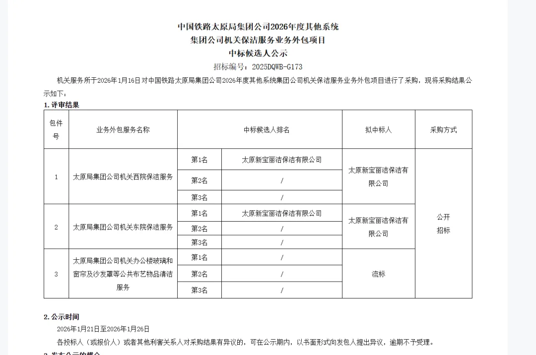 在这个名为《中国铁路太原局集团有限公司2026年度其他系统集团公司机关保洁服务业务外包项目》的中标候选人公示表里,前面两个包件,一为太原局集团公司机关西院,一为太原局集团公司机关东院的保洁服务,都是由一家名叫太原新宝丽洁的保洁公司以“第一名”中标。