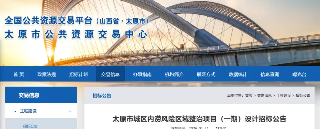1月31日,记者从全国公共资源交易平台、太原市公共资源交易中心获悉,太原市城区内涝风险区域整治项目(一期)设计招标公告已公示。太原市城区内涝风险区域整治项目(一期)设计已由项目审批/核准/备案机关批准,项目资金来源为积极争取上级资金支持,不足部分由市级财政配套保障,招标人为太原市市政公共设施建设管理中心。项目规模: