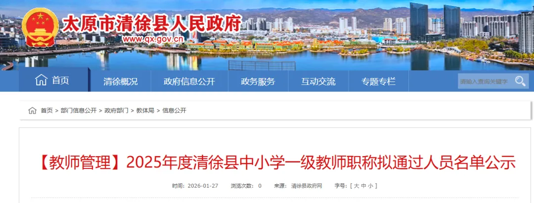 现将2025年度清徐县中小学一级教师职称拟通过人员名单予以公示。如有意见或问题,可自公布之日起5个工作日内(2026年1月27日至2026年2月2日)向清徐县教育体育局人事股反映。反映材料要签署个人姓名,写明本人工作单位、通讯地址和联系电话,以便于核实了解情况。