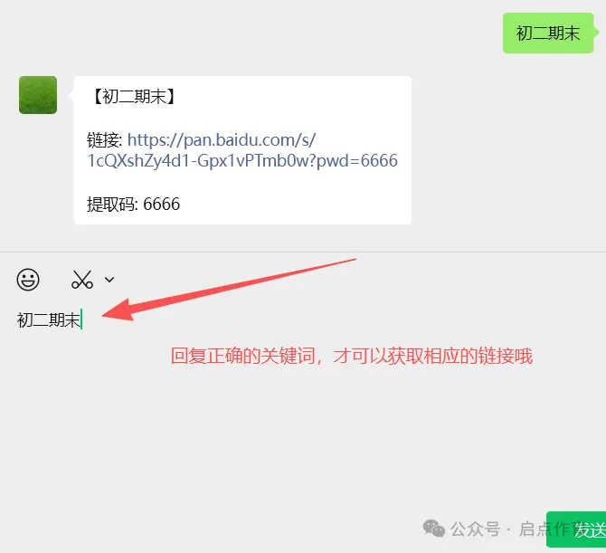 2、进入公众号对话框,回复关键词 “初二期末”,即可自动获取下载链接(链接长期有效,可反复下载)。