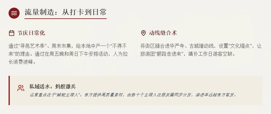 动线补充: 仅靠节庆不够,需将街区主动缝合进古城旅游动线。与华严寺、古城墙等景点形成导流默契,在街区内设置“文化锚点”(如微型民俗展示、方言墙),让旅游团与散客“顺路走进来”,以此填补工作日的游客流量空缺。
