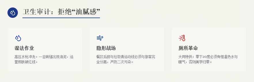 大同特供指标:热水与暖气。 在零下二十度的大同冬夜,厕所是否配备了恒温热水?暖气是否充足?这是非标商业最昂贵的运营细节,也是决定游客对“高端”二字认可度的关键。如果洗手出的是刺骨冰水,所有的美学设计都会在这一刻归零。