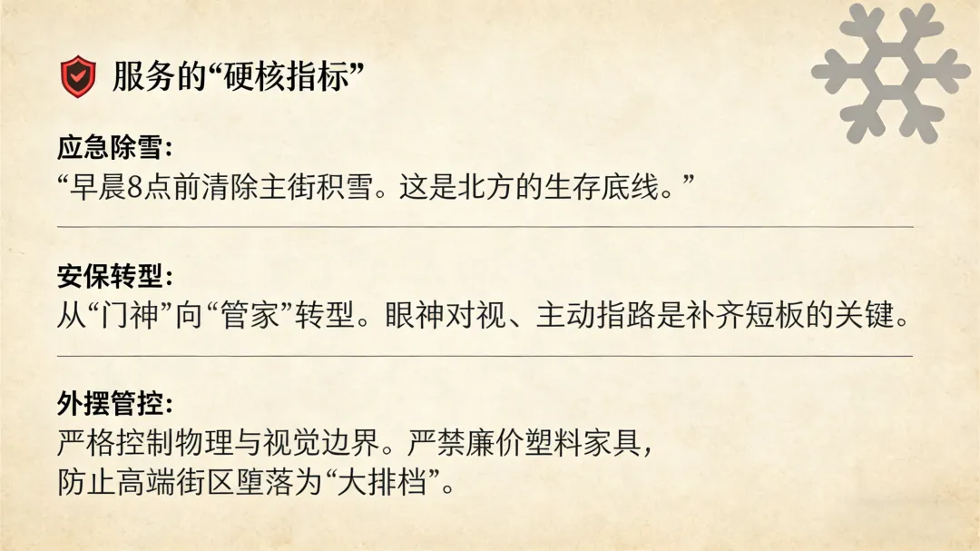 除雪: 北方的雪是美景,也是灾难。早晨8点前若不能清除主街积雪,商户无法开门,物流无法补货,直接影响全天营收。除雪速度是检验物业应急能力的硬指标。