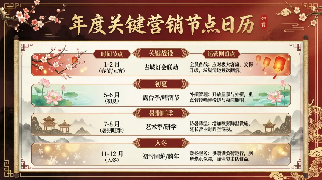 优秀的运营必须顺应天时。大同的气候决定了东南邑必须具备“两套运营系统”,并需进行动态的业态调度:
