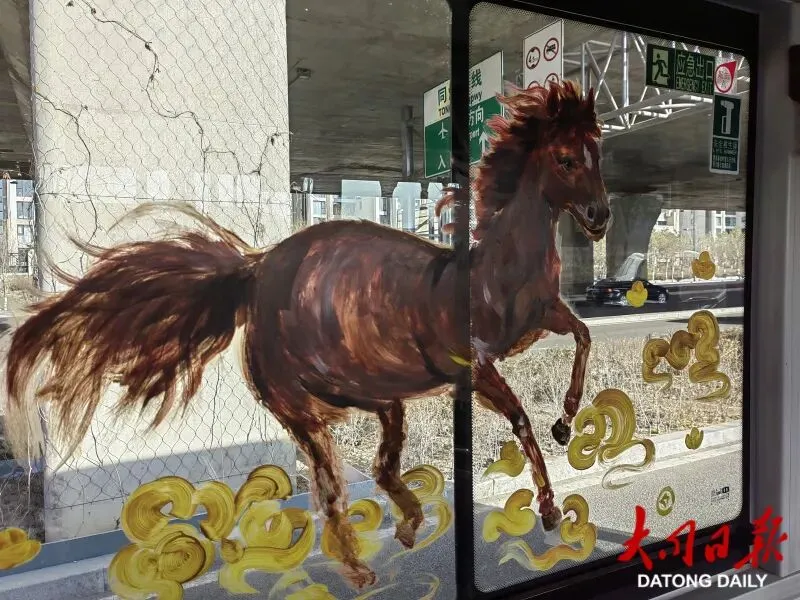 据该公司相关负责人介绍,这些线条灵动、色彩鲜艳的骏马图案,是一位职工家属倾情奉献、利用3天时间绘制的,有的借鉴了汉代铜奔马“矫健灵动”的姿态,配以祥云纹饰寓意“马到成功”;有的以温情笔触勾勒亲子骏马图景,传递“阖家团圆”的美好期许,将传统生肖文化与公交车窗巧妙融合。