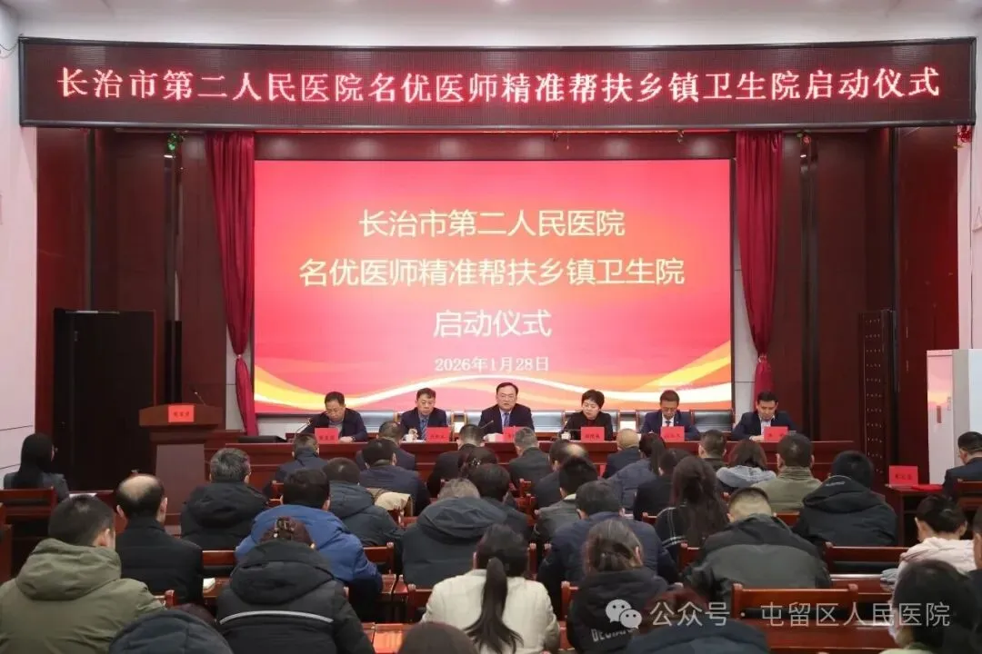为深入推进医疗卫生强基工程,加快优质医疗资源下沉,提升乡镇卫生院服务能力,2026年1月28日下午,长治市第二人民医院名优医师精准帮扶乡镇卫生院启动仪式在屯留区人民医院隆重举行。长治市第二人民医院党委书记李晓东,党委副书记、院长何跃文,党委委员、副院长段云飞及相关专家团队,屯留区副区长郝晓英,区医疗集团党委书记、院长张斌,区直医疗机构负责人、各乡镇卫生院院长及选派医护人员等共计80余人参加会议。启动仪式由区卫体局局长董爱国主持。