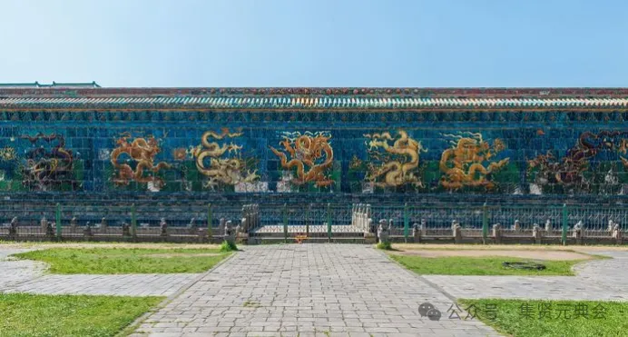 九龙壁长45米、高8米,壁面由五彩琉璃构件组成,九条龙形神各异,每两条之间以水草、白云、山石作为连接,构成一幅生动的画面。正中的一条龙造型最具威严,昂首向前,目光炯炯,气宇轩昂,体现出了我国古代高超的雕刻技艺