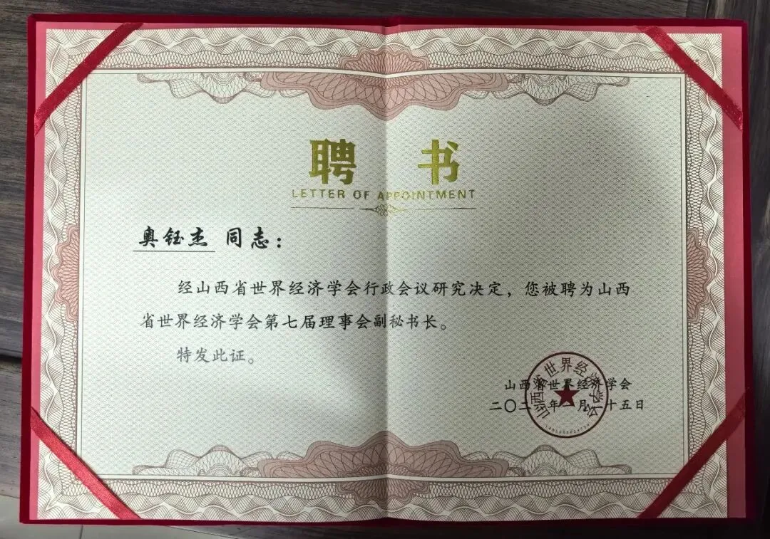 【商会动态】太原市兴县商会会长奥钰杰当选山西省世界经济学会第七界理事会副秘书长.