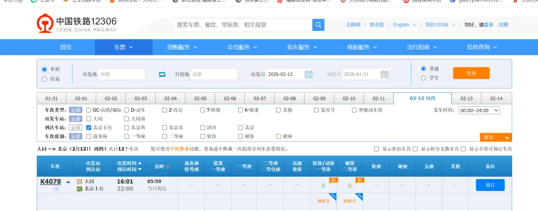据12306显示,2026年2月12日-14日,大同-北京丰台的K4078次所有席别均实行折扣,硬卧车上铺、中铺、软卧车上铺6折出售,软卧车下铺和硬卧车下铺6.1折出售。折后大同-北京丰台硬卧上铺票价58.5、中铺61.5,下铺63.5,软卧上铺89.5,下铺93.5。