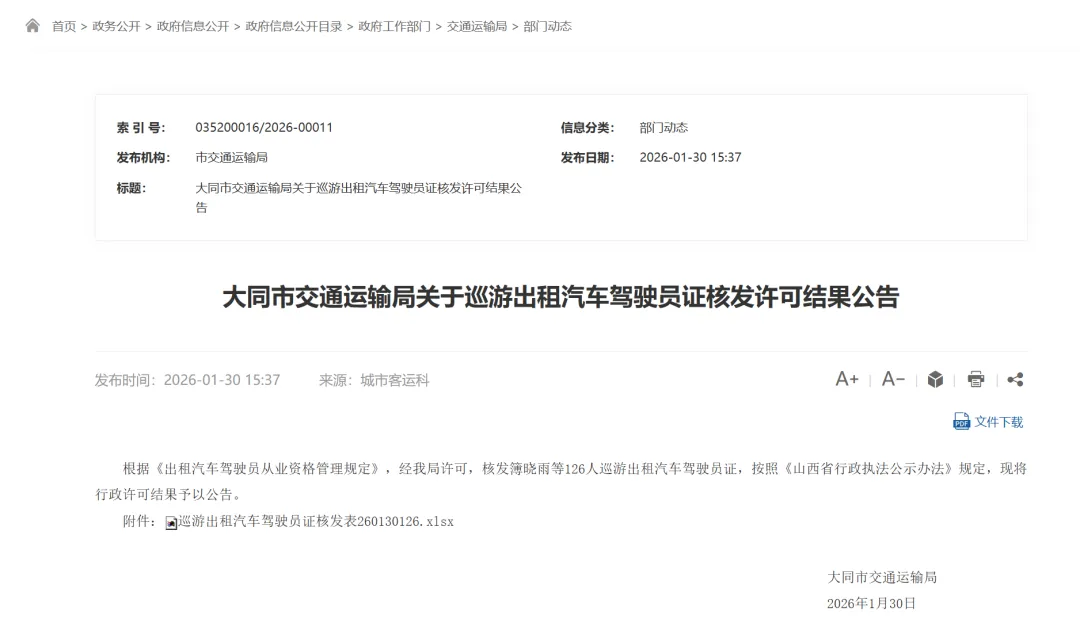 大同市交通运输局 2026年1月30日