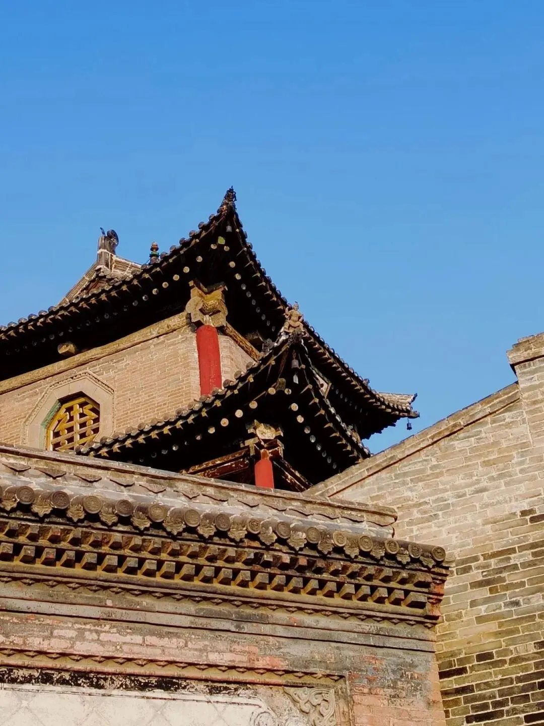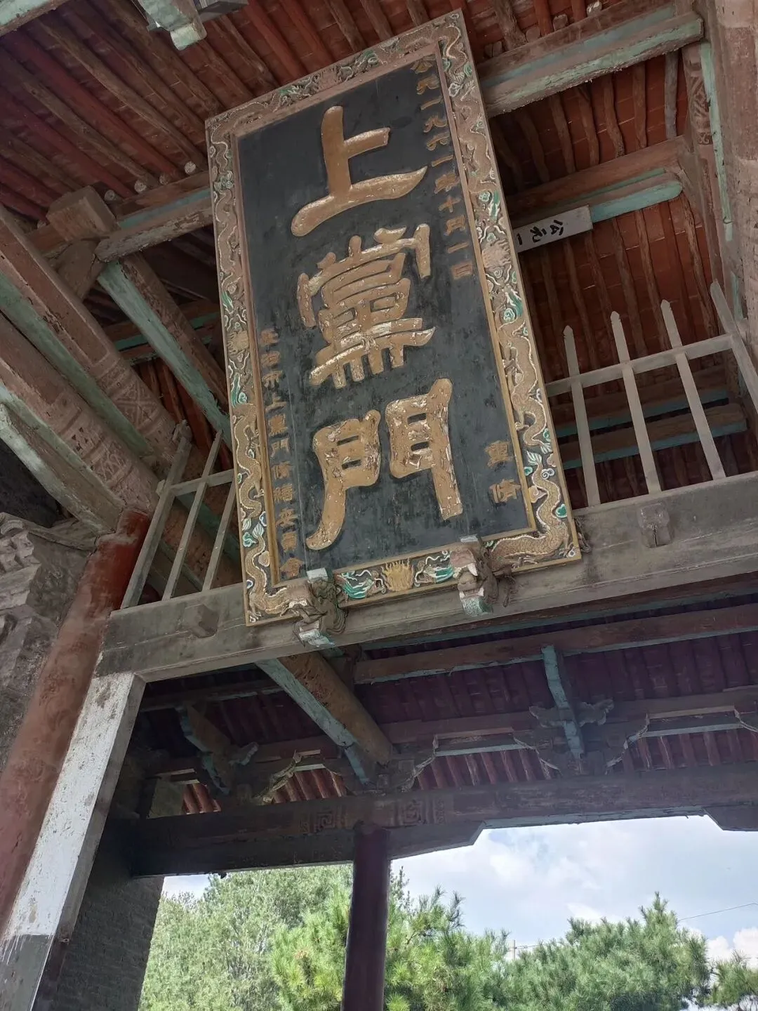从建筑形制来看,上党门采用传统的土木结构,坐北朝南,彰显着明代官式建筑的庄重与威严。它采用“一门二阙”布局,中轴线上依次分布大门、钟鼓楼及两侧配殿。正门为单檐歇山顶建筑,面阔三间,进深四椽,檐下施五踩斗拱,梁架结构保留元代“彻上明造”特征,柱头卷杀圆润,具有典型的北方官式建筑手法。