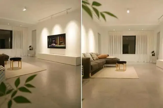 2. 简化硬装造型:吊顶做简约平顶或双眼皮吊顶,不做复杂的叠级吊顶、圆形吊顶,避免压抑层高,同时节省预算、减少积灰;电视背景墙、沙发背景墙,不做复杂的岩板、石膏线造型,用简约乳胶漆墙面,搭配装饰画、灯带点缀,后期可灵活更换;墙面、地面不做过多造型,以浅色系为主,显宽敞、好打理。