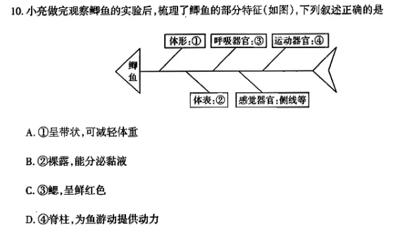 山西太原2025-2026学年第一学期七年级生物学期末试题,整体来看,是一套不错的试题,充分体现了新课改的一些理念或者说是趋势。本人仔细研读了这套试题,有一些粗浅的体会。比如,本套试卷的第10小题,该题考点是考查鱼的形态结构特征与功能,给我印象深刻的是,本题插图设计非常有特色(如下),以鱼的造型为创意起点来构建本题的插图,让考生能形象地认知鱼类,更直观地分析各选项。二、凸显山西本地情境,增强考生对家乡山西的热爱之情。比如,本套试卷的第13小题,提到了山西是苹果种植大省,通过苹果容易感染苹果花叶病毒的情境,考查病毒分类的知识。再如,第18题,通过某校组织学生到太原汾河湿地公园开展为期一年的物种调查为情境,考查了生物的分类、节肢动物的特点、生物分类的等级、汾河湿地鸟类栖息地的保护措施等内容,试卷既贴合太原考生的生活实际,也富有开放性,试题在命制上体现出的新课标要求特色明显。三、聚焦考生日常生活场景,让考生感受生物学知识生活中无处不在。比如,本试卷第12题,就以小艾妈妈买的橘子因小艾妈妈保存不当,橘子发霉长毛为情境,引发学生对橘子上长的“毛毛”究竟是什么的思考,强化学生对七年级所学真菌知识的认知。体现出生物试题的命制,源于生活,贴合生活,又高于生活的特点。也和新课标倡导的命题趋势相一致。生物学考试中,实验类试题是几乎每次考试中都雷打不动要考查到的内容,对实验原理、操作步骤、注意事项等的考查,是该类考题的核心考点,不过近几年,生物实验试题的命制,多结合开展实践活动的形式进行。像本次试卷非选择题的第19题,就通过某校近期开展的一场“制作甜酒”的实践活动为主题,考查了酵母菌发酵的原理、制作甜酒的实验操作过程、对照实验等内容,引导考生分析某些同学发酵实验做的不成功的原因、提出不同于本次实践活动的其他探究主题等等。试题体现出既考查传统实验基础知识,又体现试题考查具有开放性的特点。这也是近年来试题命制相对延续的一些命题思路。另外,我分享一些关于初中生物学学习或复习的建议吧。在教学或复习过程中,还是要立足教材基础知识,不忘关注一些身边发生的与生物学相关的事件、现象,尤其要注意七年级生物学中可能考查到的“观察身边的生物”“制作米酒、米醋”等实验或活动内容,注意联系一些与生物学相关的中华传统文化的内容等等,以期达到提升考生素养,发展考生能力的目的。作者创作不易,希望点赞+关注,更多试题内容,请关注下面二维码👇