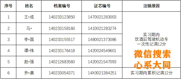 以下6名驾驶员在实习期内、实习期届满后处理实习期间发生的违法行为记满12分。