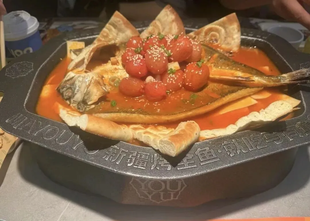 这家店开在小店万达,距离不远,起了念头,正好领着父母去尝一尝。店不大,开在万达四层,布局比较紧凑,鱼用的海鲈鱼,肉鲜嫩,刺少,汤汁浓郁入味,小食大部分是新疆特色,口感也都不错。计划下次去试试别的口味烤鱼(我们一家是很爱吃鱼的🤭)。