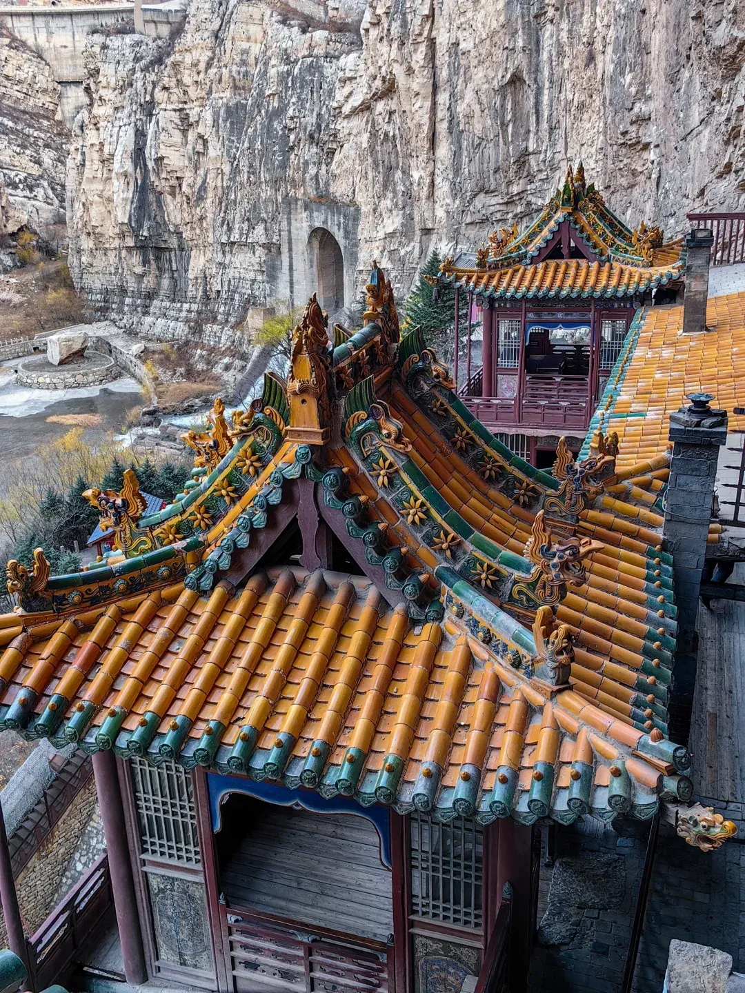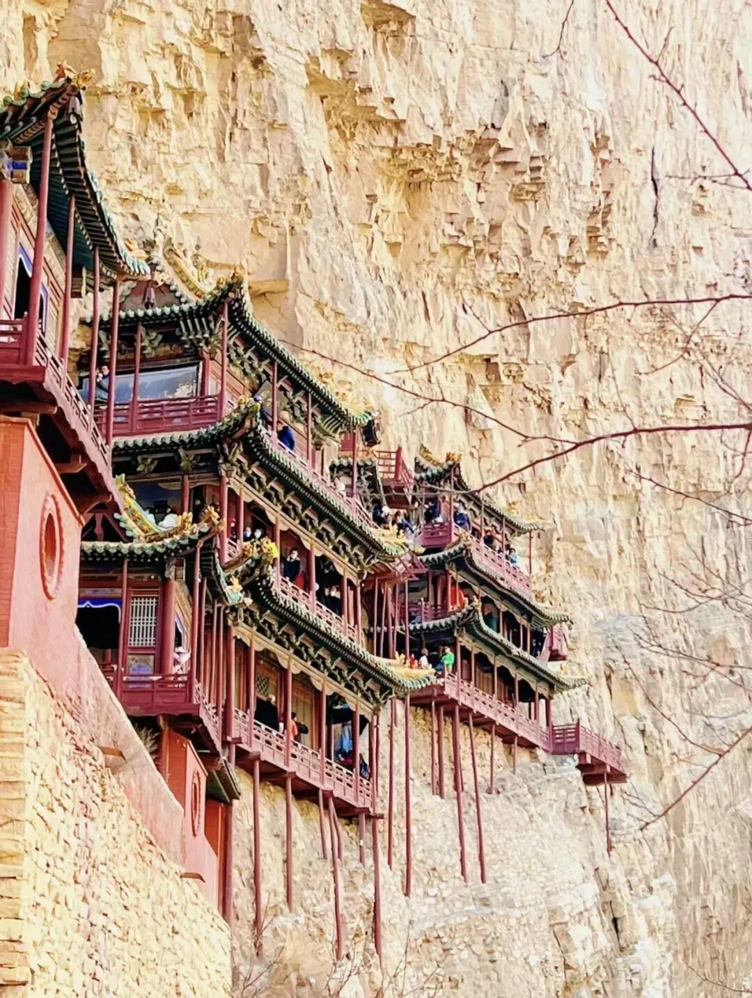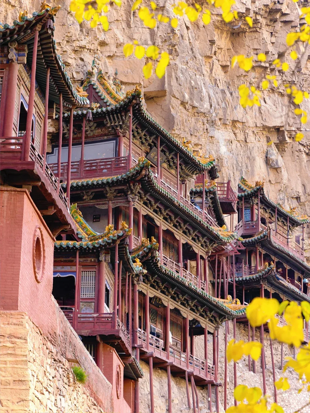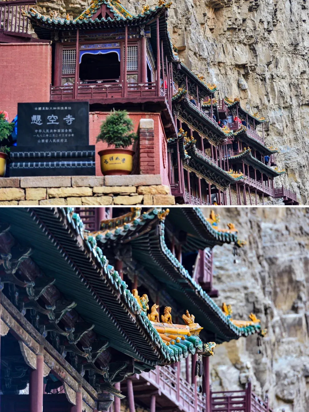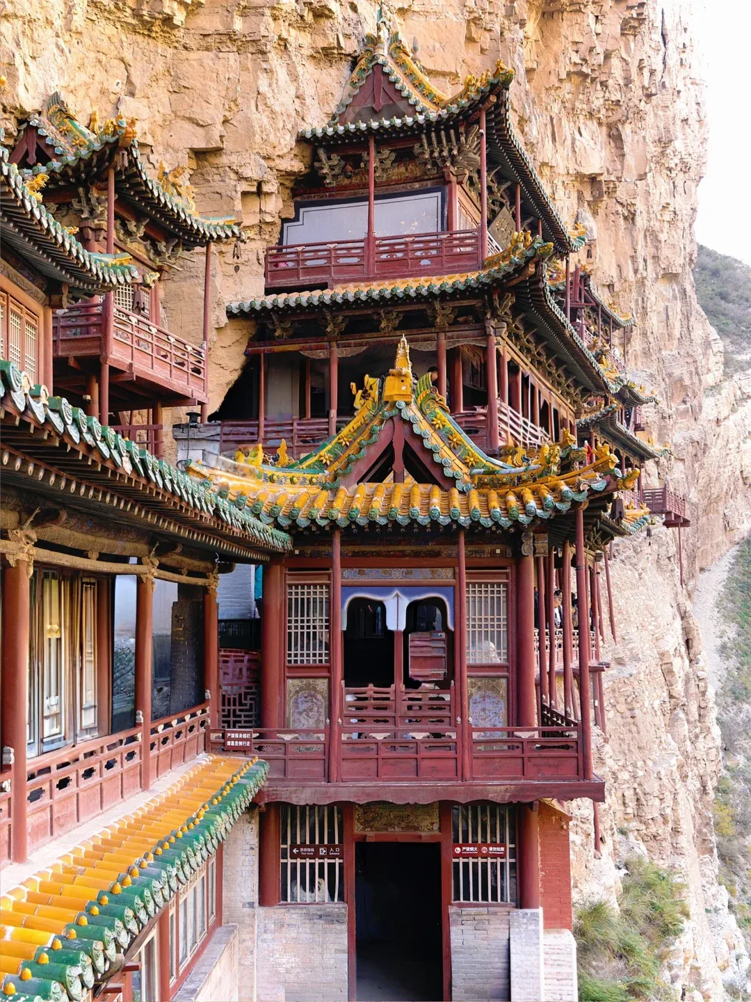 全寺为木质框架式结构,有殿琮楼阁40 间,其实悬空寺不大,最值得惊叹的是它依靠榫接结构,嵌入崖内而不倒。