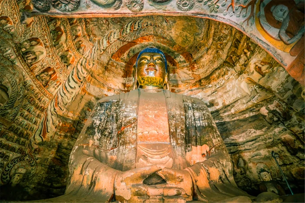 云冈石窟云冈石窟位于山西省大同市以西16公里处的武周山南麓,依山而凿,东西绵延约一公里,气势恢弘,内容丰富。现存主要洞窟45个,大小窟龛252个,造像5万1千余尊,代表了公元5至6世纪时中国杰出的佛教石窟艺术。其中的昙曜五窟,布局设计严谨统一,是中国佛教艺术第一个时期的经典杰作。
