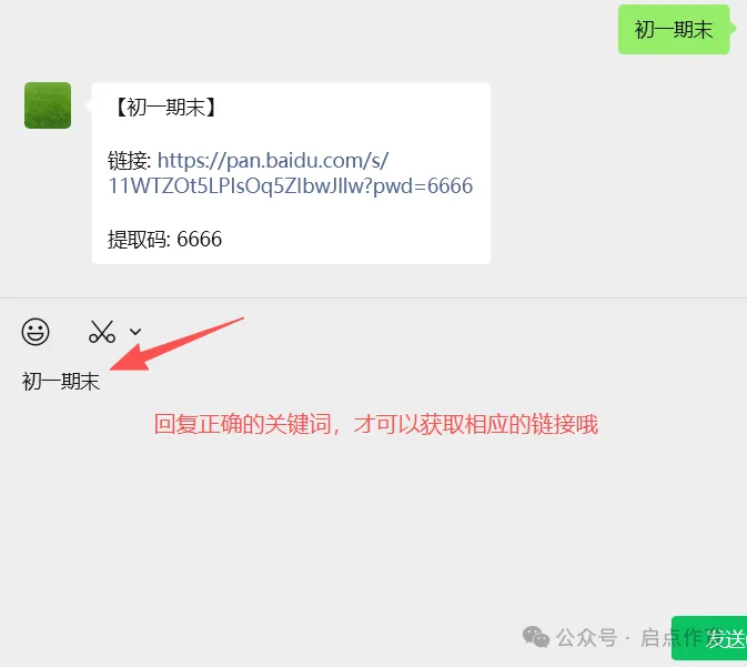 2、进入公众号对话框,回复关键词 “初一期末”,即可自动获取下载链接(链接长期有效,可反复下载)。