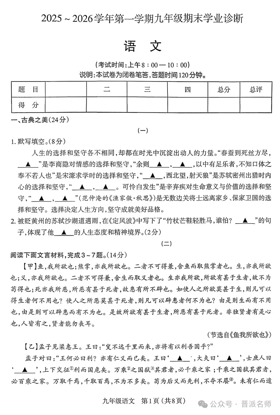 >太原2025-2026九上期末学业诊断【语文】试题+答案