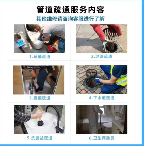 疏通下水道、马桶、蹲厕、地漏、下水管;维修马桶漏水、水管;卫生间除臭、反味处理;疏通脸盆、菜盆、墩布池;疏通主管道、疑难管道、市政管道、工业管道;提供高压清洗车、抽粪车服务;上下水管安装、改管、维修。