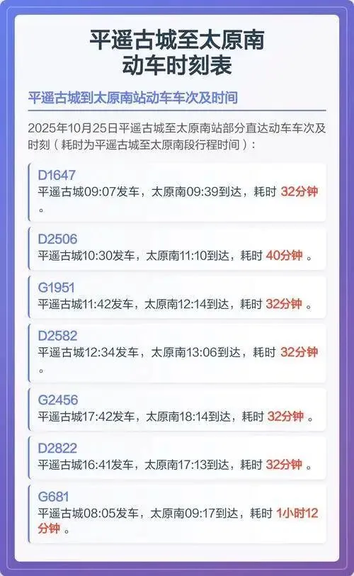 高铁优先走太原南—平遥古城—祁县这条,时间都在一小时内,车次密。