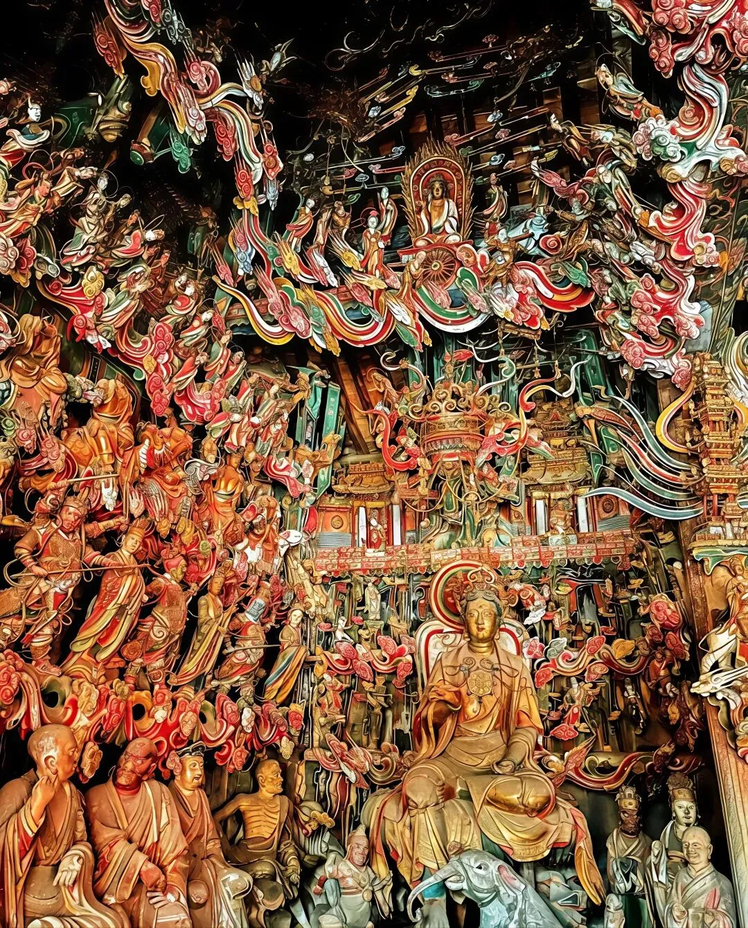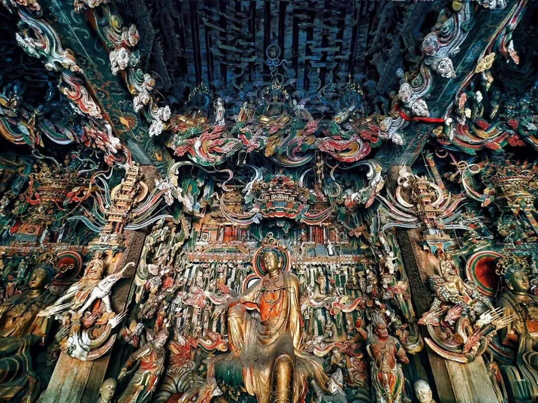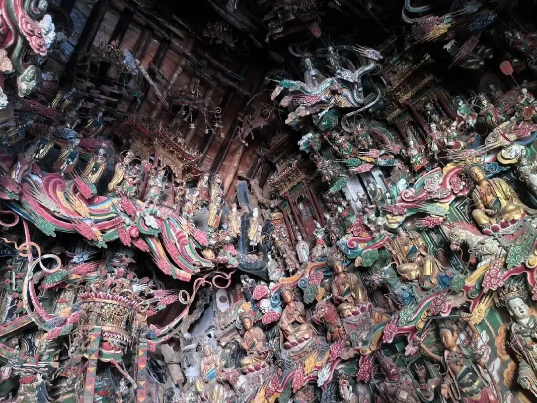 观音堂的彩塑集中在观音殿中,这一方殿阁面积不足60平方,却内集中了500多尊大小不一栩栩如生的塑像。墙壁、房顶、门窗、房梁等到处布满了彩塑,形象之灵动,色彩之绚丽,被称为“海内悬塑之冠”。