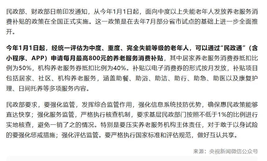 民政部、财政部日前印发通知,从今年1月1日起,面向中度以上失能老年人发放养老服务消费补贴的政策在全国正式实施。这一政策是在去年7月部分省市试点的基础上进一步全面推开。