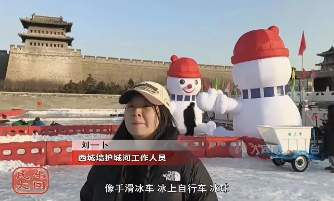西城墙护城河工作人员刘一卜:我们主要新增了手动项目,像手滑冰车、冰上自行车,冰球,手脚配合发力,能锻炼协调力,老少皆宜还安全,大人孩子都玩得开心