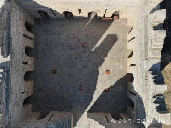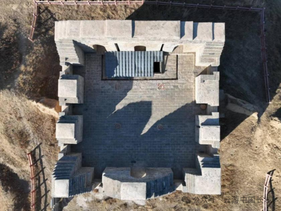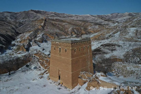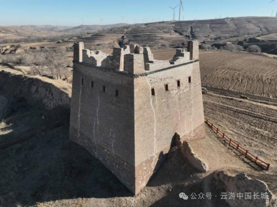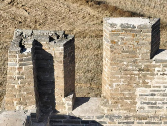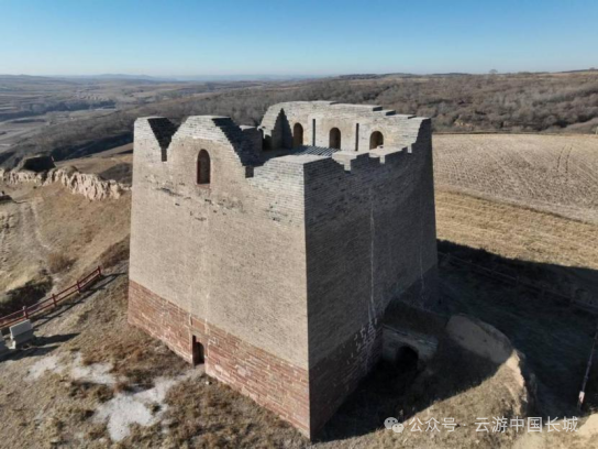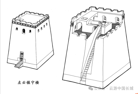 隆庆二年(1568),戚继光奉诏北上,主政蓟镇防务,到任后,便着手推广他在浙江海防前线抗倭的成功经验——营建空心敌台。在巡抚刘应节、总督谭纶以及明穆宗的支持下,于隆庆三年(1569)开始在蓟镇、昌镇营建空心敌台,至隆庆五年(1571)八月,“蓟昌镇筑敌台工城”[1],标志着空心敌台一期工程顺利结束。隆庆六年(1572)初,杨兆在奏疏中称“本镇西自镇边东抵山海,延袤二千里,计极冲之处新建敌台一千二百零六座。”[2]这1206座应当是蓟、昌二镇实际完成的空心敌台数字。谭纶、戚继光在京畿重地——蓟、昌两镇修建空心敌台,不仅极大地提高了蓟、昌两镇长城墙体的防御能力,更起到了宣传、示范作用,逐渐形成了“筑台守险为防边要务”、“墙非台则无庇,台非墙则无依”的防御观念,其他各军镇纷纷学习效仿。万历元年(1573)九月,王崇古接替方逢时,出任宣大总督一职务。万历二年(1574)二月,王崇古提议[3]参照蓟镇样式,仿建空心敌台,并获得许可。“兵部覆大同督抚官王崇古等题……向来所筑边墙,俱欠坚固,又墩台远处边墙之外,临敌之际,守台者势既悬,不敢发一矢,摆边者军又单薄,不足当其聚攻之众。宜查仿蓟镇之制,将沿边墩台改筑在内,每里先骑墙筑一座,每座三层,下层实心,中层发圈空心,各开箭眼,上层盖屋立垛,俱用甎甃。两台之中,照议筑墙,酌量冲缓,以次兴工,中间台座尚觉稀疏,五年后更议增筑。报可。”[4]王崇古计划按照一里边墙修筑一座敌台的密度营建,敌台采用砖石修筑,骑墙而建,敌台分上、中、下三层,下层为实心台基,中层为砖券砌筑的空心结构并开设箭窗,上层修建房屋,四周砌筑垛口墙。两台之中,修建长城墙体。由于工程量较大,修建顺序与蓟镇相同——根据防御压力的大小——冲缓,先修筑紧要之处的台、墙,如果发现敌台间隔较远,两台之中的中间区域防御力量薄弱,则在五年之后,即万历七年(1580)再行增筑。目前,明代大同镇长城辖区内现存3座空心敌台,分别是山西大同左云县宁鲁堡村(明代宁虏堡)镇宁楼、朔州平鲁区七墩村的“徐氏楼”、“箭牌楼”。其中,镇宁楼属北西路,“徐氏楼”、“箭牌楼”属中路。镇宁楼整体保存较好,平面呈矩形,剖面呈梯形,底部周长56米,残高16米,敌台高大、雄伟。敌台南立面底部设一门,拱券式,石门券,门券上方尚存石匾,刻有“镇宁”二字。门内设登楼梯道,因该敌台基座十分高大,故梯道斜长。中层呈回廊中心室结构,南立面设1门2箭窗,北立面设3箭窗,东西立面各设4箭窗,回廊为拱券式,中心室平面呈矩形,拱券顶,南、北、西墙各设1门。中层与顶层之间有砖仿木结构装饰顶部较为平坦,铺房情况未知,四周设垛口墙,仅存墙基。
