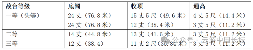 官方名称为新村3号敌台(编码:150124352101170012),当地人俗称“徐氏楼”。徐氏楼整体保存较好,平面呈矩形,剖面呈梯形,底部边长15米,顶部边长10米,残高12米,敌台高大、雄伟。敌台南立面底部设一门,拱券式,石门券,门券上方尚存石匾,刻有“洞门”二字。台门尚存门扇,对开门,门扇采用一整块石板雕凿而成,系明长城沿线目前已知仅存的一对石门板,弥足珍贵。门内设登楼梯道,因该敌台基座十分高大,故梯道斜长。“洞门”一词出自唐代刘禹锡《桃源行》:“洞门苍黑烟雾生,暗行数步逢虚明”,可联想由“徐氏楼”券洞拾级而上,顿觉天光明亮,心境亦豁然开朗,似隐寓“徐氏楼”的高大巍峨。中层为木梁架结构,东、西、北三面各设3个箭窗,南面设1门2箭窗。中层采用4根立柱支撑,如今仅存柱础,柱础所对应的墙壁上可见木柱凹槽。(李春宇 传拓)官方名称为板申沟1号敌台(编码:150124352101170015),当地人俗称“箭牌楼”。箭牌楼整体保存较好,平面呈矩形,剖面呈梯形,底部边长15米,顶部边长10米,残高17.6米,敌台高大、雄伟。箭牌楼基座十分高大,但并未设门和长长的梯道,而是在中层南墙中部开1门,以悬梯上下敌台。中层为木梁架结构,东、西、北三面各设4个箭窗,南面设1门2箭窗。箭窗形制特殊,并非常见的砖砌拱券式,而是采用石板修筑窗框。中层采用4根立柱支撑,如今仅存柱础,柱础所对应的墙壁上可见木柱凹槽。镇宁楼、徐氏楼、箭牌楼3座敌台有许多相似的地方。徐氏楼、箭牌楼主体结构相同,均为木梁架结构,但徐氏楼通过梯道上下,箭牌楼通过悬梯上下。徐氏楼、镇宁楼均为梯道上下,但主体结构方面,徐氏楼为木梁架结构,镇宁楼则为回廊中心室结构。与蓟镇空心敌台相比,敌台体量上的差异也是十分明显的。蓟镇空心敌台依据建筑尺寸——底部周长、顶部周长和高度的差异,可分为3个等级,如表:就现存空心敌台而言,以三等敌台为主。此类敌台底部周长38米,顶部周长36米,通高11米,这个体量与大同镇敌台相比,差异是十分明显的。究其原因,或许与地形有关。蓟镇长城普遍处于崇山峻岭之上,可用建筑面积有限,加之有“地利”加持,因而敌台体量总体较小。大同镇则截然相反,长城所在地为高原地貌,不差“地皮”,但地势平坦,无险可恃,因而只能修建高大、雄伟的空心敌台来提高防御能力。镇宁楼、徐氏楼、箭牌楼3座敌台的修筑时间尚无文字实证。从建筑结构上看,徐氏楼、箭牌楼与蓟镇A型(木梁架型)敌台(集中修建于隆庆三年至万历元年)类似,值得注意的是,大同镇仿建蓟镇空心敌台始于万历二年(1574),此时,蓟镇空心敌台已经“升级”成C型(回廊中心室型)敌台,或许是因为交通不便,信息闭塞的原因,导致大同镇无法知晓蓟镇已将敌台“升级”,也无法获取最新“版本”的设计图纸,因而仿建蓟镇“旧版”的敌台。由此推测,徐氏楼、箭牌楼应建于万历二年(1584),属总督王崇古第一批仿制的空心敌台。镇宁楼与蓟镇C型(回廊中心室型)敌台(集中修建于万历二年至万历十一年)相似,但敌台装饰十分繁缛,台门石券脸上有精美的雕花装饰,中层与顶层之间有精致的砖仿木结构装饰,此类装饰现存最早的实例是右卫城南、北门(万历三年)、新高山城东门瓮城南门(万历五年),集中出现在万历中后期,并更加繁缛,如破虎堡南城南门(万历二十五年)、将军会堡西门瓮城南门(万历二十五年)、许家庄堡(万历二十八年)、得胜堡南门(万历三十四年)、助马堡东城南门(万历三十八年)、杀胡堡(平集堡)南门(万历四十六年)等等。由此推测,镇宁楼应修建于万历三年(1575)前后。