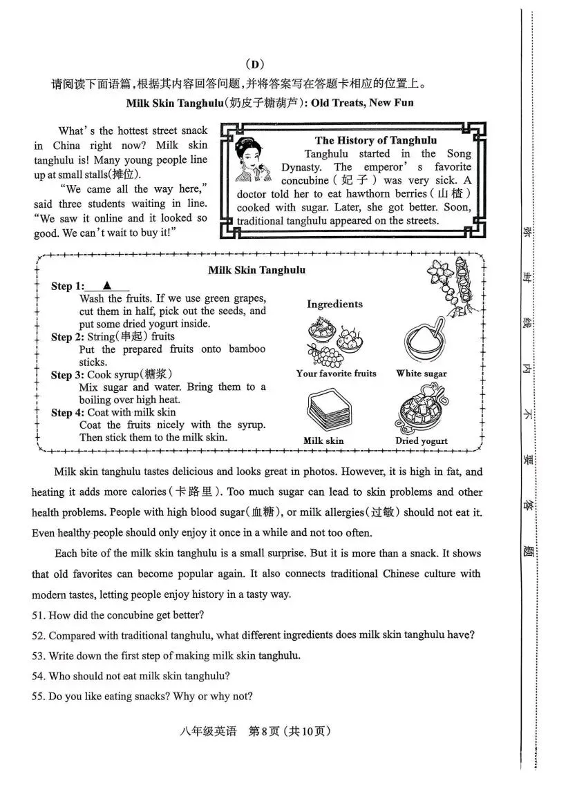 53. Prepare the fruits54. People with high blood sugar or milk allergies .55. Yes , I do . Because they are delicious and can connect traditional culture with modem life ./... No , I don ' t . Because they are often too high in sugar and fat to be healthy ./...(答案不唯一,符合题意即可得分。)