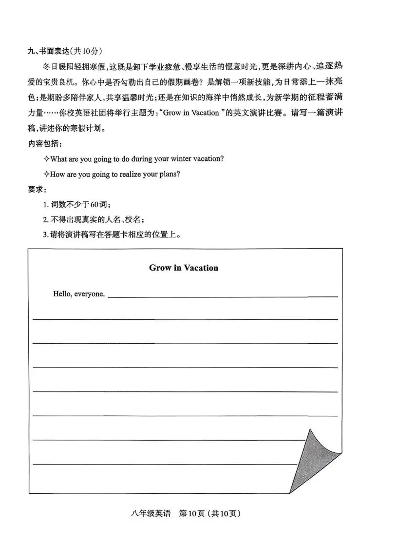 九、书面表达(共10分) Hello , everyone . Winter vacation is a great time to relax and improve myself . I plan to jog in the park every moming to stay ealthy . I am going to learn cooking from my grandma , starting with simple dishes , to help myfamilyand become more independent . I also want to get better at English , so I am going to study for three hours daily and read one English story each day . I am going to tr my best to achieve my plans step by step . I believe small steps can lead to big progress !