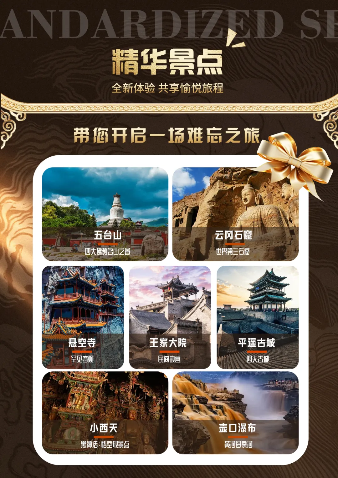 (云冈石窟首道+景交、悬空寺首道+景交、五台山、王家大院、小西天、壶口瀑布首道+景交;及全程耳麦)