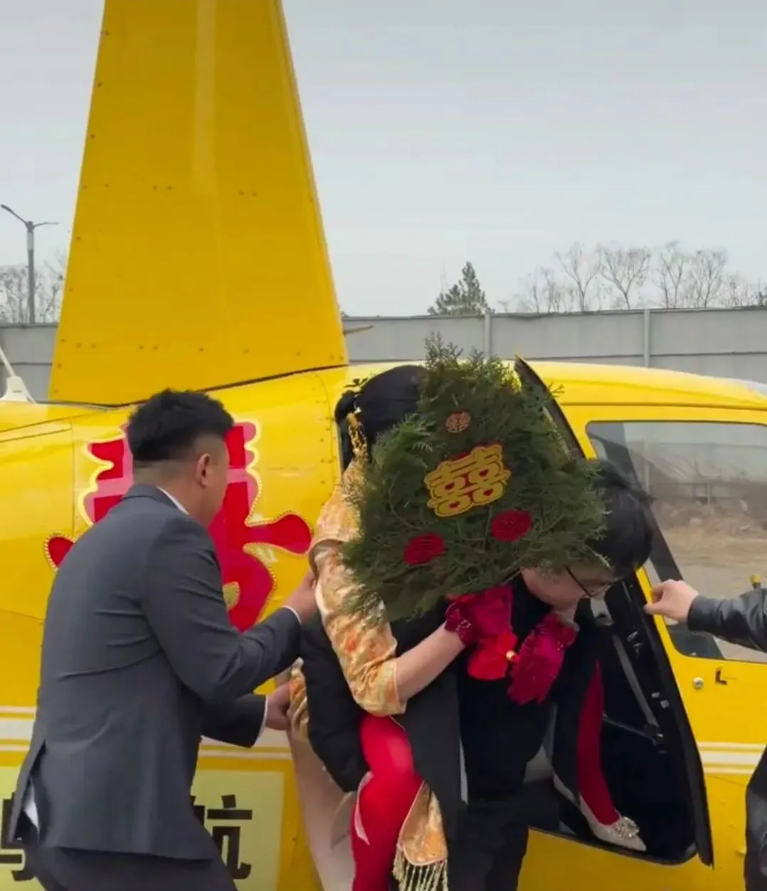 1月29日,在太原市清徐县,一对新人选择了一种极具创意的方式开启他们的婚姻之旅——搭乘机身贴有鲜艳大红“囍”字的直升机完成接亲环节,这一浪漫举动给传统婚礼增添了别样的看点。