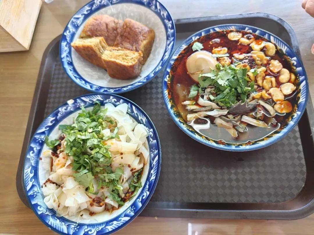 悬空寺出来,直奔应县木塔。抵达门口的时候已经饿得前胸贴后背,听说浑源凉粉不错,尝尝去!对比半天走进一家开在应县木塔马路对面的凉粉店。点上一份凉粉套餐,再点一份面皮,又加了一个烧饼,结账时听到才18元?先是一愣,第一个反应是:难道我点少了?确实,确实点少了。但不是因为菜量少不够吃,而是因为太好吃了一碗下肚不过瘾!又加了一碗纯羊杂和一个烧饼,这才算过了瘾。