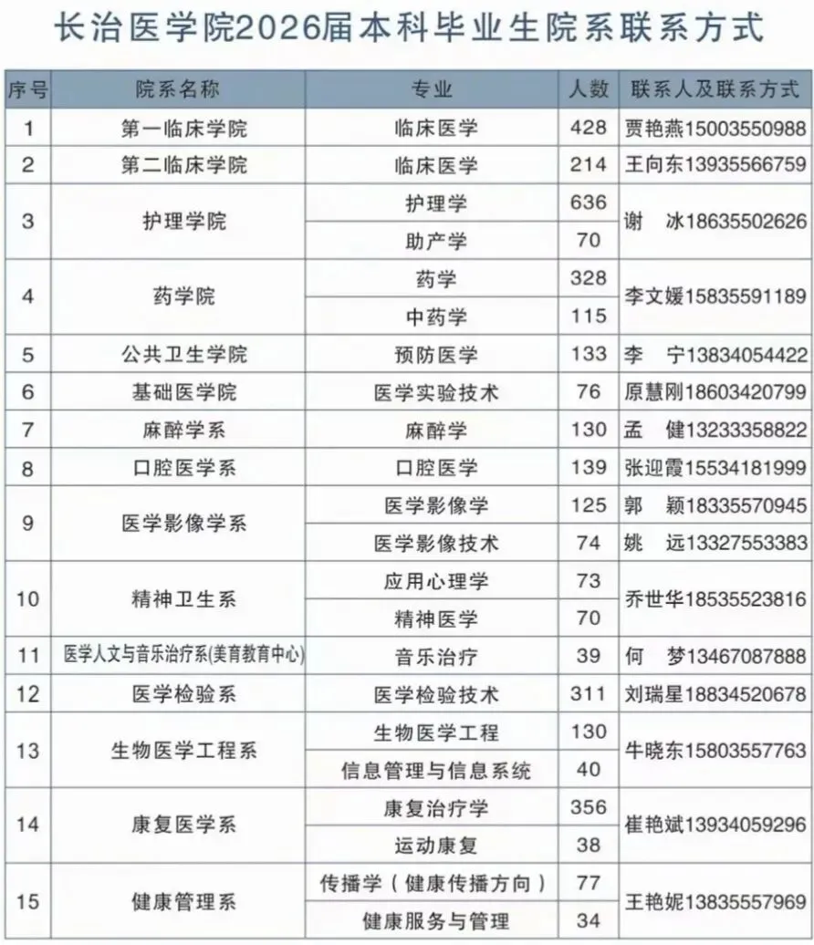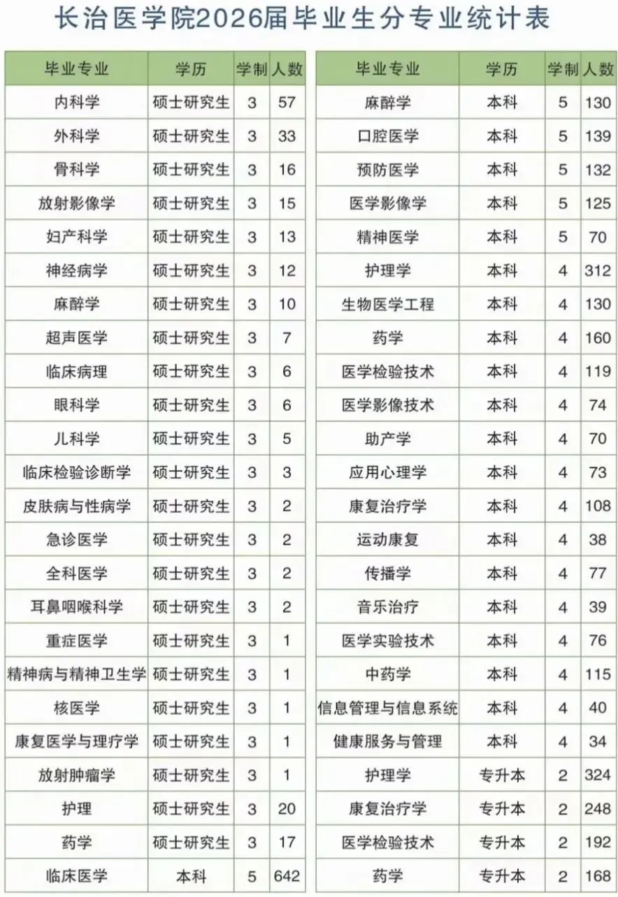 长治医学院:专硕5个(临床医学、护理、药学、医学技术、公共卫生),深造率15%.