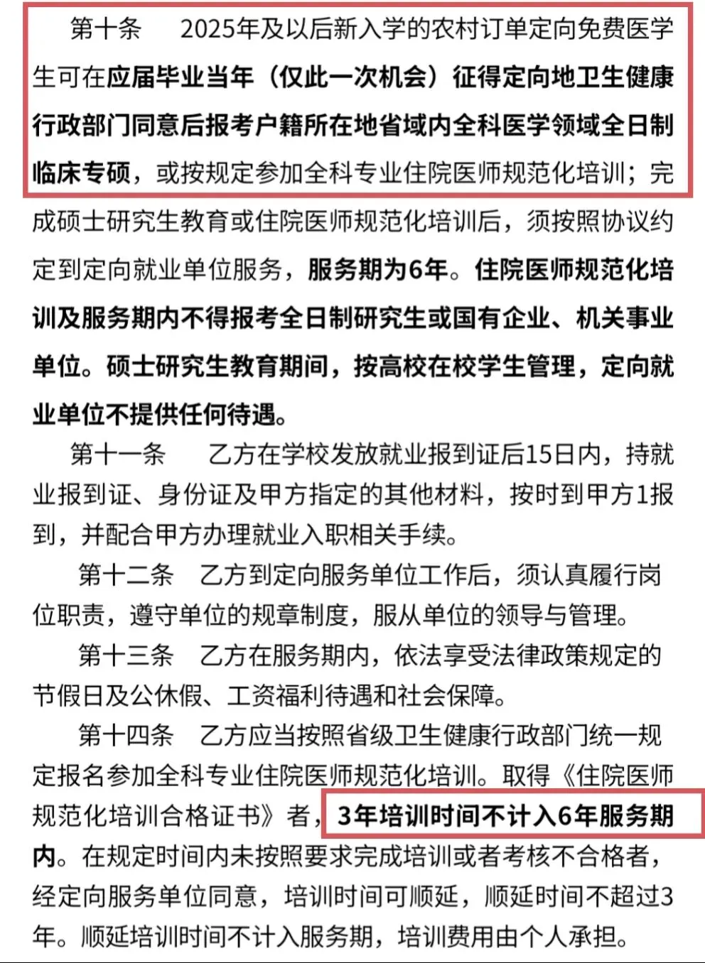 ①从2025年开始,免费医学生在应届毕业当年(仅此一次机会)征得定向地卫健部门同意后,可报考省域内全科医学全日制临床专硕研究生,完成研究生教育后再按就业协议到定向单位服务6年。