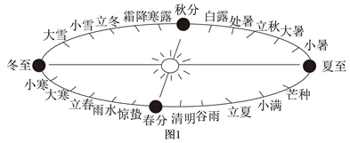 圭表是一种天文仪器,它由垂直的表和水平的圭组成,利用了立竿见影的原理来测量日影长度。其主要功能是测定二分二至日、四季(中国的传统四季以四立为起始点,四立为立春、立夏、立秋和立冬)和回归年长度。图1为二十四节气示意图,图2为我国某地圭表示意图,图中圭上的刻度代表二分二至日和四立。完成下面小题。