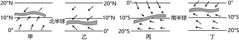 丙、丁两图热带辐合带位于南半球,北半球应为冬季,我国无台风登陆,C、D错误。