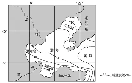 解析:根据图中等盐度线可知,渤海表层海水盐度呈现出自中部向南北逐渐降低的趋势,B正确,ACD错误。