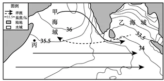 解析:由图可知,甲海域北部盐度较高,船舶吃水深度较浅,其南部则相反,A错误;