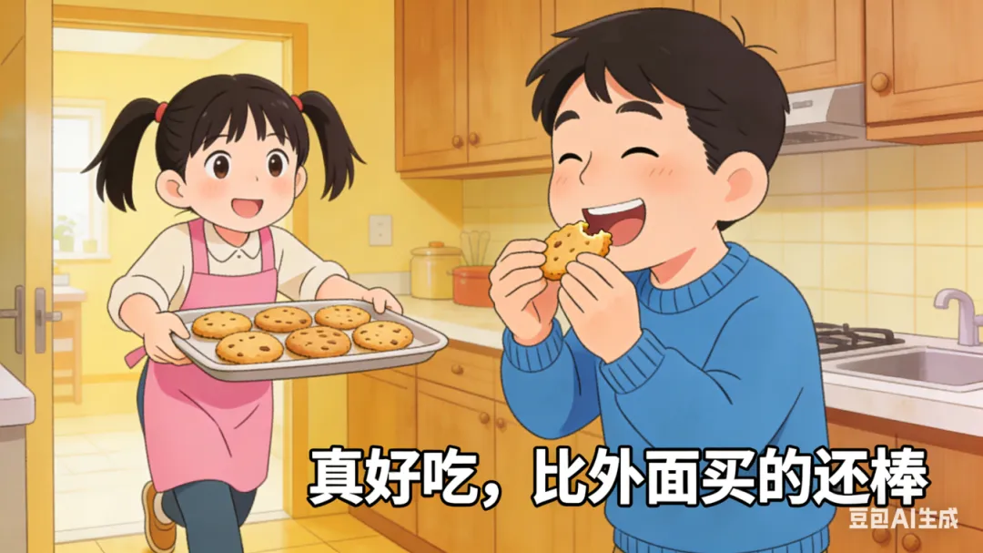 这下好了,我们全家人终于能一起吃团圆饭了,我跑到厨房, 给小叔拿了一个我自己做的饼干, 他吃了后,连连夸赞我,说他还要吃,让我多做些。