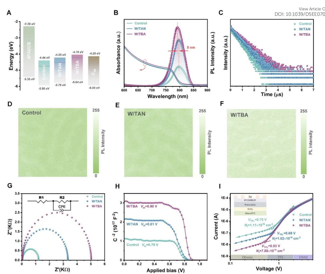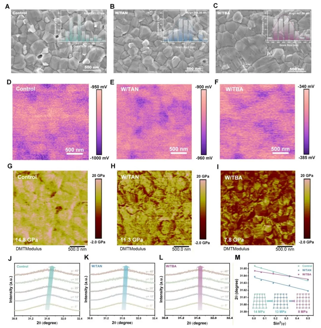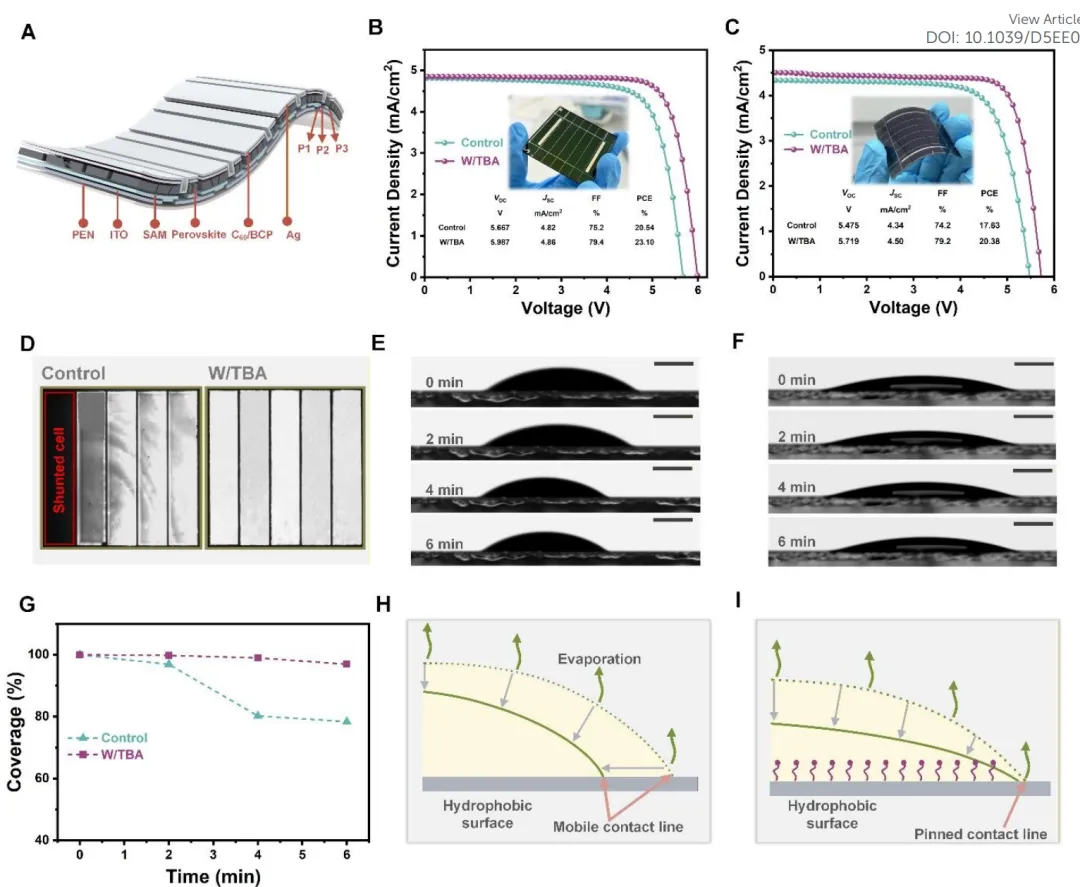 柔性钙钛矿太阳能电池(f-PSCs)在便携式电源应用中具有补充传统硅基太阳能电池的巨大潜力,但其商业化进程依赖于溶液法沉积工艺的规模化放大能力。目前,钙钛矿在自组装单分子层(SAMs)上的非均匀沉积给大面积制备无针孔、高质量薄膜带来了巨大挑战。本研究开发了一种两亲性交联单体(TBA),该分子能够同时促进柔性基底上的钙钛矿生长并确保规模化过程中的均匀沉积。TBA的引入显著提升了钙钛矿墨水与底层疏水性SAM层之间的润湿性和粘附性,在刚性及柔性基底上均实现了高质量、均匀的钙钛矿薄膜制备,展现出优异的规模化制造潜力。基于此策略,改性后的钙钛矿太阳能电池实现了27.12%(认证效率26.41%,刚性)和24.95%(柔性)的卓越光电转换效率(PCE),并兼具优异的机械稳定性和操作稳定性。经TBA改性的柔性器件在经历10,000次弯折循环和1,000小时连续运行后,仍能保持超过90%的初始效率。此外,大面积钙钛矿太阳能组件(PSMs)也分别实现了23.10%(刚性)和20.38%(柔性)的显著效率,充分验证了该策略的规模化应用前景。这一创新性策略为高性能柔性光伏技术的工业化发展开辟了新途径。钙钛矿太阳能电池作为高效光伏家族的最新成员,其光电转换效率(PCE)已突破27%,展现出前所未有的发展潜力。该类器件不仅制备工艺简便,可采用溶液加工和低温制造,更因轻质、便携的特性而成为柔性电子领域的明星材料。柔性钙钛矿太阳能电池(f-PSCs)在便携式电源、建筑一体化光伏(BIPV)及物联网(IoT)等创新应用场景中表现出独特优势,实验室小面积器件效率已达25.30%。然而,将实验室高效率电池转化为大面积太阳能组件时,如何最小化效率损失成为关键难题。核心挑战源于钙钛矿前驱体墨水与基于自组装单分子层(SAMs)的疏水性空穴传输层(HTLs)之间的不良润湿性,这直接导致大面积成膜时出现非均匀沉积、针孔缺陷及覆盖不完整等问题,严重制约了柔性钙钛矿光伏组件的性能与可靠性。针对柔性基底(如聚对苯二甲酸乙二醇酯PET、聚萘二甲酸乙二醇酯PEN)表面粗糙度较高的问题,传统制备过程易诱发过度成核,形成晶粒尺寸小、脆性大的钙钛矿薄膜,这被认为是限制柔性器件性能追赶刚性器件的关键瓶颈。虽已有研究通过引入纳米颗粒中间层(如Al₂O₃、NiOₓ)或利用1,3-二甲基-3,4,5,6-四氢-2(1H)-嘧啶酮(DMPU)、4,4',4''-次氮基三苯甲酸(NA)等添加剂改善成膜质量,近年来发展的交联单体如环氧封端的OETC、含动态共价二硫键的TA-NI及三丙烯酸季戊四醇酯(PETA)等,虽在调控结晶、优化机械性能方面取得突破,但现有交联体系的可扩展性仍显不足,难以满足大面积均匀制备的需求。因此,开发兼具解决结晶优化与规模化放大双重功能的新型材料策略,成为推动f-PSCs商业化进程的迫切需求。本研究充分利用交联单体在促进柔性基底钙钛矿生长方面的优势,精心设计并开发了一种名为TBA的两亲性交联单体,旨在实现高效f-PSCs的规模化可控制备。该分子的独特之处在于其分子结构的两亲性设计:一端为疏水性片段,含动态共价二硫键的五元环作为交联活性位点,可在热退火处理过程中同步触发开环聚合反应与钙钛矿结晶生长,实现对柔性钙钛矿薄膜结晶过程的精细调控;另一端为亲水性苯硼酸基团,能够显著改善钙钛矿前驱体墨水在疏水基底上的润湿性,从而大幅提升大面积薄膜沉积的均匀性与可扩展性。在TBA的辅助下,钙钛矿在塑料基底上实现了优化结晶,并确保了在大面积基底上制备均匀、高质量的薄膜。最终,刚性及柔性器件分别实现了27.12%(认证效率26.41%)和24.95%的卓越光电转换效率。更重要的是,TBA改性的柔性器件展现出优异的机械弯曲稳定性和操作稳定性,在经历10,000次弯折循环和1,000小时最大功率点(MPP)连续运行后,仍能保持超过90%的初始效率。该策略成功应用于大面积组件制备,刚性及柔性大面积钙钛矿太阳能组件分别实现了23.10%和20.38%的显著效率,有力推动了柔性钙钛矿光伏技术的商业化进程。研究团队受天然小分子硫辛酰胺(TAN)启发,巧妙设计了功能化交联单体TBA。该分子由四大关键部分组成:含二硫键的疏水性五元环(聚合位点)、柔性脂肪族连接链、酰腙连接键(缺陷钝化)及亲水性芳香族硼酸端基。静电势(ESP)测算显示TBA具有2.28 D的较高偶极矩,有利于载流子捕获。拉曼光谱证实,TBA在60°C左右发生开环聚合反应(特征S-S峰503 cm⁻¹分裂为503和534 cm⁻¹),该温度与钙钛矿退火工艺(100°C)完美匹配,确保聚合与结晶同步进行,形成柔软可拉伸的聚(TBA)网络结构。通过X射线光电子能谱(XPS)和傅里叶变换红外光谱(FTIR)深入探究了TBA与钙钛矿的相互作用机制。XPS结果显示,经TBA改性后,Pb 4f、N 1s和I 3d特征峰均向低结合能方向显著移动,表明TBA与欠配位Pb²⁺形成了强配位作用,并通过N-H···I和O-H···I氢键与FAI组分相互作用。FTIR光谱中,TBA的-C=O伸缩振动峰从1664.7 cm⁻¹移至1661.1 cm⁻¹,FAI的-NH振动峰从3381 cm⁻¹移至3356 cm⁻¹,¹H NMR显示FAI中铵基共振信号发生分裂和上移,充分证实了氢键的形成。TBA的引入显著改善了钙钛矿薄膜的晶体质量与表面形貌。扫描电子显微镜(SEM)观测显示,TBA改性薄膜在PEN/ITO基底上展现出447.56 nm的平均晶粒尺寸,显著大于对照组(263.02 nm)和TAN改性组(305.38 nm),且过量的PbI₂含量显著降低。截面SEM显示TBA改性薄膜具有垂直于基底排列的规整大晶粒。原子力显微镜(AFM)测得TBA改