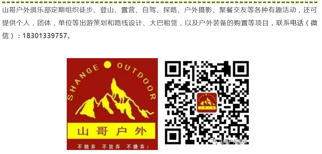 ▌ 装备要求1、身份证件:① 身份证必备,若没有正式身份证,请速办理临时身份证。② 其他有效打折证件:导游证、学生证、军官证、士兵证、残疾症,老年证等,可能减免门票证件,统统带上,要求必须是真证件,使用伪造证件,后果自己承担。2、服装鞋帽:① 衣服:4/9/10月准备秋季外套一件,11/12/1/2月准备抓绒冲锋衣或者棉衣、羽绒服等,5/6/7/8/月防晒服、短袖即可,早晚准备秋季外套。沿途紫外线强记得带防晒霜和墨镜。② 鞋类:休闲鞋或旅游鞋,1双或2双;徒步鞋,1双。③ 另根据自身需要,携带遮阳帽、手套等!3、日常用品:①洗护:洗漱用品(牙刷、牙杯、洗面奶旅行装)护肤品(水乳旅行装)化妆品、防晒霜、护手霜、唇膜等;②装饰:墨镜、太阳镜、保温杯、雨伞、雨披、手电(备足电池)等;4、摄影通讯:① 通讯:手机、耳机、充电器、充电宝等;② 摄影:单反相机,长焦镜头、广角镜头、三脚架、摄影包防雨罩,以及超大存储卡和相关充电器;5、路餐食物:各种水果、纯净水、高热量食物(巧克力、饼干、面包、火腿肠)、佐餐(榨菜、海带丝、萝卜丝)等。6、随身药物:建议携带感冒药,消化药,创可贴,防蚊液,风油精、晕车药等;以及个人根据自身情况,携带相关药物!▌ 活动小贴士1)本活动属于户外旅行活动,纯玩,全程不进购物店,没有任何形式购物环节,领队也不作购物推荐,敬请谅解;同时本活动所有费用已明示(包括有可能您自愿自费的项目),无其它任何收费,请您仔细阅读费用包含和费用不含内容。2)活动出发前会统一给大家发集合信息通知所有队员(微信或短信),包括领队电话、集合时间地点、车牌号等活动信息,队员请以集合信息为准准时集合;车上座位顺序为集合时先到自由选择,迟到视为自动放弃后续行程,请恕费用不退。3)活动行程时间仅供参考,受天气、交通、客流量、景区或政府调整等影响有可能会发生变化,请以领队实际安排为准;文中照片仅供参考,不做为本次活动要约;户外活动不同于常规旅行活动,报名时未成年人、60周以上老年人、残疾人、孕妇、患者、港澳台和外籍人士报名需报名时说明,领队有挑选队员的权利。▌ 报名须知凡参加本次户外活动人员必须充分解读以下条款:1、户外活动存在危险与不确定性!参加活动人员必须年满18周岁(未成年人需由法定监护人监护),身体健康,有民事自主能力的公民,并已知晓自己所参与的活动存在不确定性和危险性以及完全理解户外活动(费用自理、责任自负、风险自担)之概念。请参与队员自行认定活动的轻重性,并对出发至返回过程中所有不可预见的意外及风险具备足够的心理及生理承受能力,参加此次活动纯属个人自愿行为,如发生意外与其他同行者及组织方无关。建议参加人员购买相关保险。2、责任声明:本活动为非盈利性质的自助结伴游活动并具有一定的危险性,参加者必须对自己的安全负责,活动中发生意外事故,同行者可根据实际情况组织救援或改变活动计划,但不承担任何法律和经济责任,特此声明。活动开始后,本声明将自动生效并表明你接受本声明,否则,请在活动开始前退出本次活动。3、免责条款:此户外活动属于自助性质的出行活动,当由于意外事故和急性疾病等不可预测因造成身体损伤时,其他成员尽力救助,但如果造成了不可逆转的永久损伤,其他成员不承担任何(精神和经济)责任。团队中的任何一个队员本着“在力所能及情况下尽力救助、风险自担”的原则参加救助活动。注:本文中所包含的部分文字及图片来源于网络,仅做研究、学习、欣赏之用,如有侵权请联系作者删除。