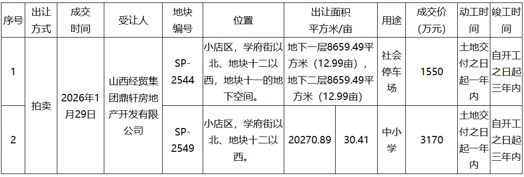 SP-2549中小学用地,位于小店区学府街以北、地块十二以西,出让面积20270.89平米,约30.41亩,成交价3170万元。