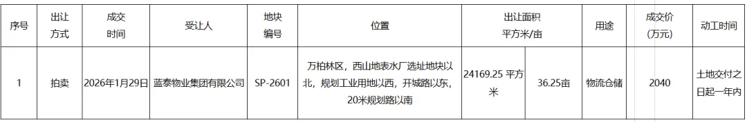 SP-2601地块为物流仓储用地,地块位于万柏林区,西山地表水厂选址地块以北,规划工业用地以西,开城路以东,20米规划路以南,出让面积24169.25 平方米,36.25亩,成交价2040万元,受让人蓝泰物业集团有限公司。