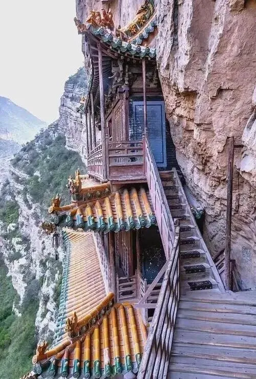 悬空寺靠在峭壁上,木头榫卯一节挨一节,三教同堂坐在一面墙前,佛、道、儒都能认出来。